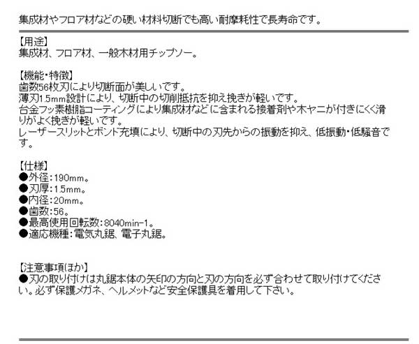 【商品詳細】【用途】集成材、フロア材、一般木材用チップソー。【機能・特徴】歯数56枚刃により切断面が美しいです。薄刃1.5mm設計により、切断中の切削抵抗を抑え挽きが軽いです。台金フッ素樹脂コーティングにより集成材などに含まれる接着剤や木ヤニが付きにくく滑りがよく挽きが軽いです。レーザースリットとボンド充填により、切断中の刃先からの振動を抑え、低振動・低騒音です。【仕様】●外径:190mm。●刃厚:1.5mm。●内径:20mm。●歯数:56。●最高使用回転数:8040min-1。●適応機種:電気丸鋸、電子丸鋸。【用途】集成材、フロア材、一般木材用チップソー。【機能・特徴】歯数56枚刃により切断面が美しいです。薄刃1.5mm設計により、切断中の切削抵抗を抑え挽きが軽いです。台金フッ素樹脂コーティングにより集成材などに含まれる接着剤や木ヤニが付きにくく滑りがよく挽きが軽いです。レーザースリットとボンド充填により、切断中の刃先からの振動を抑え、低振動・低騒音です。【仕様】●外径:190mm。●刃厚:1.5mm。●内径:20mm。●歯数:56。●最高使用回転数:8040min-1。●適応機種:電気丸鋸、電子丸鋸。【商品サイズ】幅190×高さ190×奥行1.5mm 重量210g■商品コード:4977292310055■JANコード:4977292310055■ブランド名:SK11■商品名:黒硬刃(木工用チップソー)■規格:190X56P【送料について】北海道、沖縄、離島は送料を頂きます。