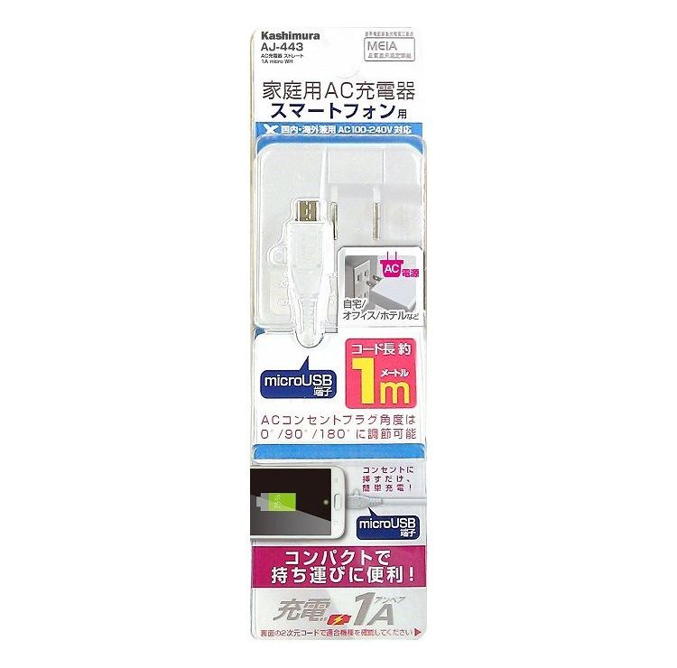 カシムラ AC充電器 ストレート1m 1A micro WH AJ-443