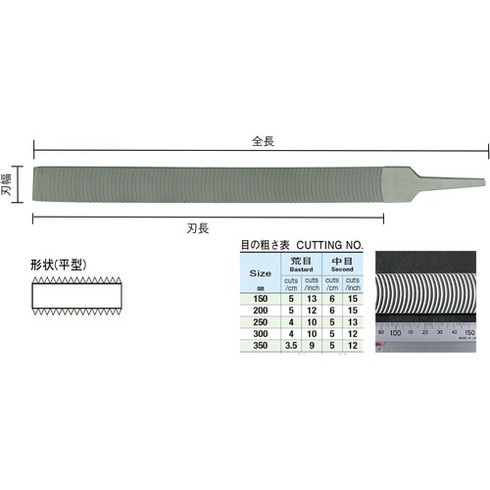 【商品スペック】特長●打ち込みタイプの目立てとは異なり、切削加工によって、刃を形成したヤスリです。●目のピッチが大幅に荒いことから、目詰まりを起こしやすいワークに適し、良好な仕上げ面が得られます。用途●銅、アルミなどの軽金属や塗料膜落とし、硬質ゴム、プラスチック、木材などの加工に。仕様●タイプ:中目●全長(mm):250●刃長(mm):200●刃幅(mm):21●刃厚(mm):5●形状:平●柄サイズ:M●適合ヤスリ柄コード:ME900M仕様2●ヤスリ目:波目材質/仕上●炭素工具鋼セット内容/付属品注意【代引きについて】こちらの商品は、代引きでの出荷は受け付けておりません。【送料について】北海道、沖縄、離島は送料を頂きます。