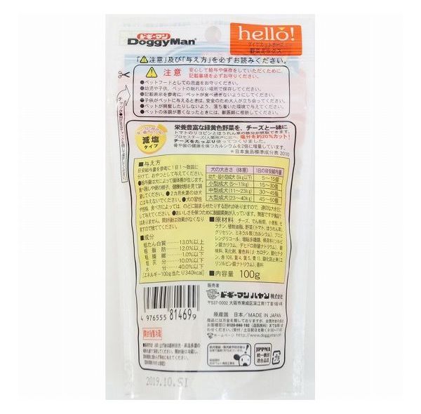 【取り寄せ品のご注意事項(ご注文前にご確認ください)】・本商品は原則注文後のキャンセルはお受けできません。・本商品と他商品で同梱注文をいただき、仮に他商品が完売等でご用意できない場合でも本商品は発送させていただきます。・本商品を複数(2点以上)注文いただき、完売等で注文数のご用意できない場合でもご用意できた数量は発送させていただきます。【商品説明】栄養の宝庫、おいしいチーズを愛犬に!・人間用のプロセスチーズに比べ、約20%塩分をカット!カルシウムを2倍に増量して乳清タンパクを加えた、愛犬仕様のスペシャルアイテムです。・トマトとほうれん草を使用してアレンジした色鮮やかなオリジナルチーズ。小さくてかわいい三角形にカットして、各種栄養素のスムーズな補給を助けます。●原材料(成分)チーズ、でん粉類、小麦粉、ゼラチン、植物油脂、野菜(トマト、ほうれん草)、グリセリン、ミネラル類(カルシウム)、プロピレングリコール、増粘多糖類、保存料(ソルビン酸カリウム、デヒドロ酢酸ナトリウム)、酸味料、乳化剤、食用色素(β-カロテン、酸化チタン、赤106、黄4、黄5、青1)、酸化防止剤(エリソルビン酸ナトリウム)、香料●賞味/使用期限(未開封)12ヶ月※仕入れ元の規定により半年以上期限の残った商品のみ出荷致します●保存方法別途パッケージに記載●原産国または製造地日本●メーカー名ドギーマンハヤシ 株式会社【送料について】北海道、沖縄、離島は送料を頂きます。