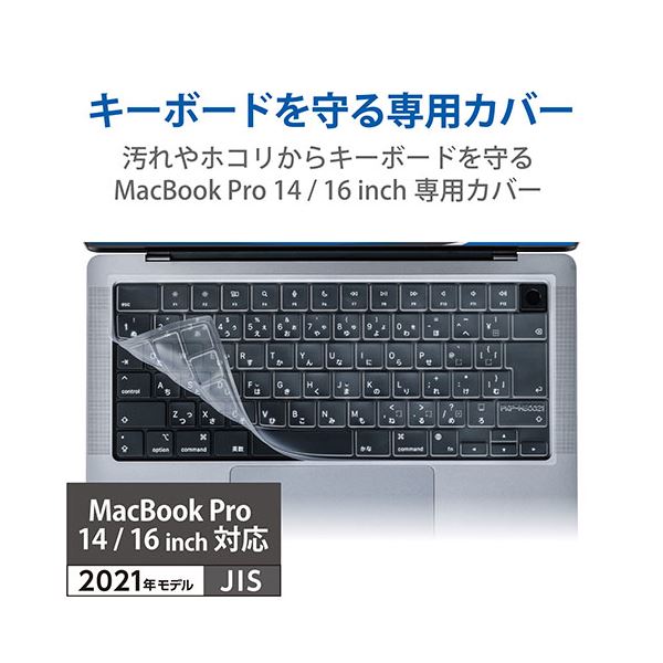 ■商品内容■キーボードを汚れやホコリから防ぎ清潔に使う、専用サイズのキーボード防塵カバーです。■極めて薄く、キーボードの凹凸部分にフィットするため、違和感のないタイピングが可能です。■サラサラとした手触りで、ホコリや汚れからキーボード部分を守ります。■無機系銀抗菌加工により、雑菌の繁殖を抑え、清潔さをキープします。■タイピングしても破れにくい、耐久性に優れた素材を使用しています。■油、水の浸入による誤操作がなくなり、作業現場での入力作業も安心して行えます。■キーボードカバーのTouch ID部分に穴が空いています。■MacBook Pro 14インチ、16インチの両対応になります。■商品スペック■対応機種:MacBook Pro 14インチ、16インチ(2021対応)。※2022年2月時点での情報です。■抗菌加工:抗菌機能付き■材質:ポリウレタン■カラー:クリア※サイズ・重量の記載がある場合は概算表記です。■送料・配送についての注意事項●本商品の出荷目安は【4 - 7営業日 ※土日・祝除く】となります。●お取り寄せ商品のため、稀にご注文入れ違い等により欠品・遅延となる場合がございます。●本商品は仕入元より配送となるため、沖縄・離島への配送はできません。[ PKP-MB0021 ]