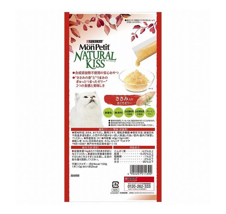 【取り寄せ品のご注意事項(ご注文前にご確認ください)】・本商品は原則注文後のキャンセルはお受けできません。・本商品と他商品で同梱注文をいただき、仮に他商品が完売等でご用意できない場合でも本商品は発送させていただきます。・本商品を複数(2点以上)注文いただき、完売等で注文数のご用意できない場合でもご用意できた数量は発送させていただきます。【商品説明】ネコちゃんとの絆をさらに深める安心のナチュラルおやつ■合成添加物不使用【無着色・無香料・合成調味料不使用・合成増粘剤不使用・グレインフリー】気になる合成添加物を一切使っていないナチュラルなおやつでネコちゃんと楽しいおやつタイム♪■2つの食感と味わいで美味しい!新鮮なささみを丁寧にほぐし、まぐろの旨みが詰まったやわらかゼリーに閉じ込めたダブル食感の美味しさ。舐めるたびにお口の中で混じる2つの食感と味わいにネコちゃんも夢中に!●原材料(成分)ささみ、まぐろだし、酵母エキス、増粘多糖類●保証成分たんぱく質4.5%以上、脂質0.05%以上、粗繊維1%以下、灰分2%以下、水分95%以下●賞味/使用期限(未開封)18ヶ月※仕入れ元の規定により3か月以上期限の残った商品のみ出荷致します。●保管方法別途パッケージに記載●原産国タイ●メーカー名ネスレ日本 株式会社 ネスレピュリナペットケア【送料について】北海道、沖縄、離島は送料を頂きます。