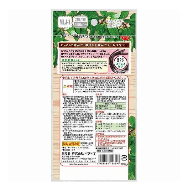 【商品説明】旨みたっぷりな鶏ササミにまたたびを加えたロングサイズのジャーキー。楽しくておいしいスナックにネコちゃん大満足!またたびとは・・・つる性植物で、マタタビラクトンなどを含み、この成分にネコちゃんが反応し、じゃれたり、リラックスした状態になると言われています。○原材料鶏ササミ、またたび(虫えい果)、でんぷん類、グリセリン、ソルビトール、リン酸塩(Na)、保存料(ソルビン酸K)、発色剤(亜硝酸Na)○賞味/使用期限(未開封)12ヶ月※仕入れ元の規定により3ヶ月以上期限の残った商品のみ出荷致します○保管方法※直射日光・高温多湿の場所をさけて保存してください。※開封後は必ずチャックを閉じて冷蔵庫で保存し、賞味期限に関わらずなるべく早くお与えください。○原産国日本○メーカー名株式会社 ペティオ【取り寄せ品のご注意事項(ご注文前にご確認ください)】・本商品は原則注文後のキャンセルはお受けできません。・本商品と他商品で同梱注文をいただき、仮に他商品が完売等でご用意できない場合でも本商品は発送させていただきます。・本商品を複数(2点以上)注文いただき、完売等で注文数のご用意できない場合でもご用意できた数量は発送させていただきます。【送料について】北海道、沖縄、離島は送料を頂きます。