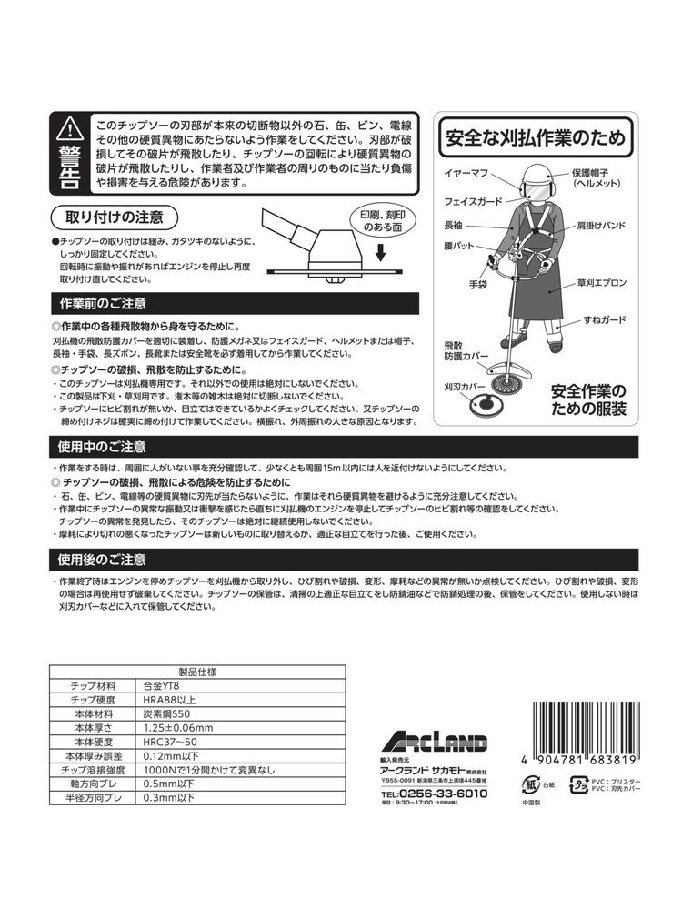 【商品説明】草刈機・刈払機を用いた草刈りの際にご利用いただく接地刈用の草刈チップソーです。ひざ丈〜腰丈くらいまでの雑草を低く短く刈ることができます。刃数が多く、チップは四面研磨のため切れ味が良いです。【注意事項】安全カバー、安全靴、保護メガネなどをご使用ください。作業中に異常な振動・衝撃を感じたら直ちにエンジンを停止してチップソーのヒビ割れなどの確認をしてください。摩耗により切れの悪くなったチップソーは新しいものに取り換えるか、適正な目立てを行ってください。【仕様】材質:本体:炭素鋼S50チップ:合金YT8色:ブラック/シルバー用途:草刈機・刈払機を用いた草刈りの際に(接地刈用)サイズ(約):D255×W255×H2mm本体厚さ:1.25±0.06mm重量(約):430g刃数:40穴径:25.4mm硬度(超硬チップ/本体):HRA88以上/HRC37〜50超硬チップの溶接強度:1000Nの力を1分間かけて変異なし軸方向のブレ:0.5mm以下半径方向のブレ:0.3mm以下適合使用場所:ひざ丈〜腰丈くらいまでの雑草超硬チップの仕様:四面研磨【特長】チップソー、刈払機、刈払い機、草刈り機、255、255mm、36p、刃、替刃、草、草刈、接地、接地刈り、接地刈、内径、穴径、25.4、25.4mm【送料について】北海道、沖縄、離島は送料を頂きます。