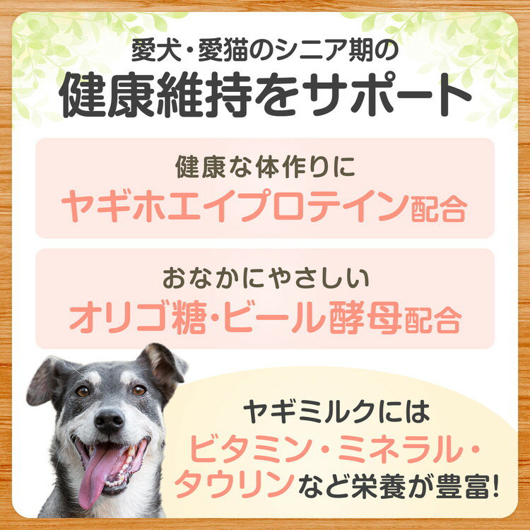 【商品説明】おいしさはそのままで、中高齢期の愛犬・愛猫に必要な成分をプラスしたゴートミルク。ヤギホエイプロテイン配合で健康な筋肉の維持を、オリゴ糖・ビール酵母配合でおなかの健康維持をサポートします。保存料、着色料は一切使用しておりません。ヤギミルクにはカルシウム、ビタミン、ミネラル、マグネシウム、カリウム等が豊富に含まれ、命の源といわれるタウリンの含有率は牛乳の約20倍に及びます。また、ヤギミルクは良質なたんぱく質源であり中鎖脂肪酸も含まれています。脂肪球が牛乳の約1/6である為、牛乳に比べて消化しやすく、母乳に最も近いと言われています。お水で溶かしてミルクとして与えれば、お水を飲まない子の水分補給もできます。フードに混ぜたり、ふりかけとして与えるのもおすすめです。〇原材料ヤギミルク粉末(脱脂)、ヤギホエイプロテイン、オリゴ糖、ビール酵母〇賞味/使用期限(未開封)24ヶ月※仕入れ元の規定により3ヶ月以上期限の残った商品のみ出荷致します〇原産国ヤギミルク粉末(オランダ)、ヤギホエイプロテイン(オランダ)、オリゴ糖(日本)、ビール酵母(リトアニア)〇給与方法【ペットへの与え方】フードにふりかけるか、パウダー5gにつき50ccのぬるま湯で溶かしてください。【一日の給与量の目安】体重3kgにつき5g(小さじ大盛り1杯程度)。与える量は体調、年齢、運動量などにより異なりますので状況により調整してください。〇保管方法直射日光・高温多湿を避けて保存してください。開封後は賞味期限に関わらず早くお与えください。〇メーカー名株式会社 ペットプロジャパン〇諸注意本品は、天然素材を使用しております。多少色が変化する場合がありますが、品質には問題ありません。【取り寄せ品のご注意事項(ご注文前にご確認ください)】・本商品は原則注文後のキャンセルはお受けできません。・本商品と他商品で同梱注文をいただき、仮に他商品が完売等でご用意できない場合でも本商品は発送させていただきます。・本商品を複数(2点以上)注文いただき、完売等で注文数のご用意できない場合でもご用意できた数量は発送させていただきます。【送料について】北海道、沖縄、離島は送料を頂きます。LINK単品6個セット12個セット24個セット