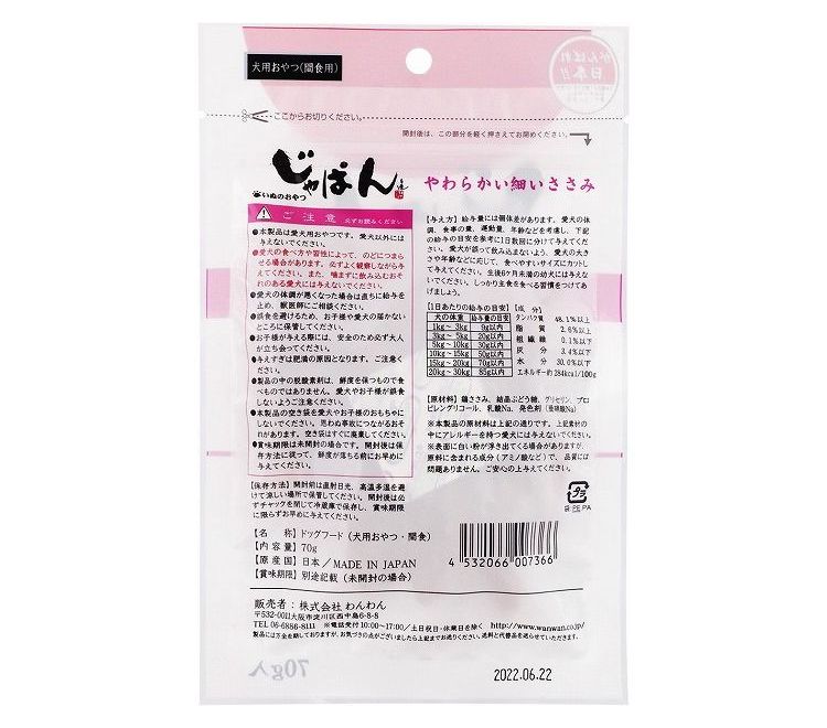 【商品説明】ソフト食感のささみジャーキーを細くカットし食べやすく仕上げました。○原材料鶏ささみ、結晶ぶどう糖、グリセリン、プロピレングリコール、乳酸Na、発色剤(亜硝酸Na)○賞味期限別途パッケージに記載※仕入れ元の規定により3ヶ月以上期限の残った商品のみ出荷致します○保存方法別途パッケージに記載○原産国日本○メーカー名株式会社わんわん【送料について】北海道、沖縄、離島は送料を頂きます。