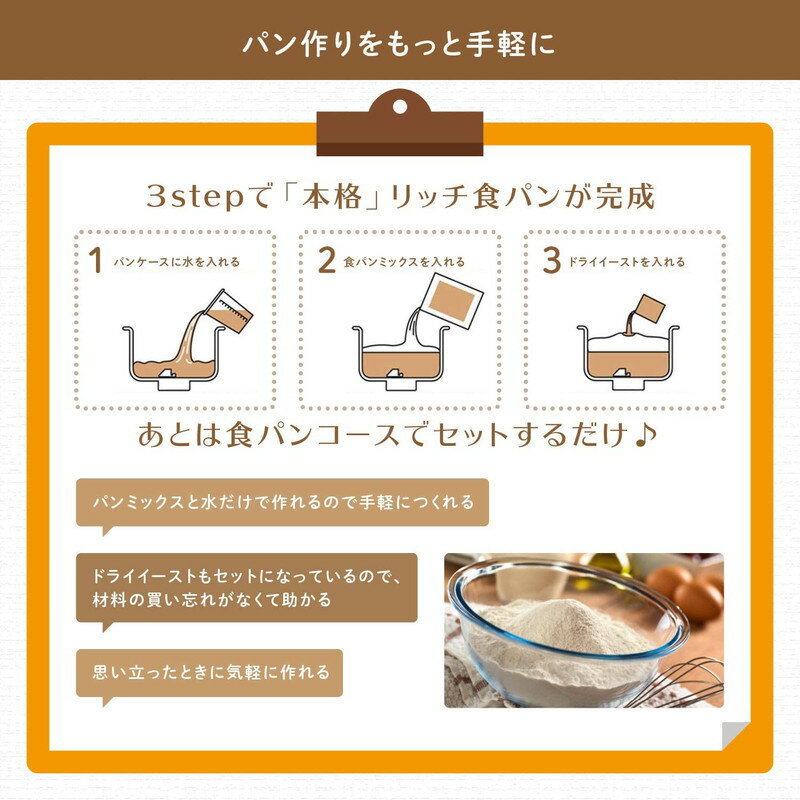 ●「毎日おいしい」食パンミックスシリーズとして、さらにリーズナブルにお試し頂けるお手軽パンミックス。小麦の豊かな香りと味わいがお楽しみ頂けます。●食パンミックスとドライイーストがセットなので、水だけ用意すればいいだけの簡単お手軽さが人気。面倒な計量が必要なく、すぐにセットできるので時間がない時にもオススメ。リーズナブルながら、味にトコトンこだわった食パンミックスです。●ほんのり甘く、よりしっとりと、優しい食感の食パンです。【商品詳細】●原材料:[パンミックス]小麦粉(国内製造)、砂糖、植物油脂、でん粉、食塩、脱脂粉乳 / 酵素、香料、乳化剤、ビタミンC、カゼインナトリウム、(原材料の一部に小麦・乳成分・大豆を含む)、[ドライイースト]イースト / 乳化剤、ビタミンC (※パンミックス製造工場では、卵を含む製品を生産しております。)●成分表記:(パンミックス100gあたり)エネルギー/376kcal・たんぱく質/10.3g・脂質/4.3g・炭水化物/73.9g・食塩相当量/1.9g(サンプル品分析による推定値)●寸法:約W19.0×H12.0×D14.0cm●質量:約1kg●製品内容:パンミックス250g×4袋、ドライイースト2g×4袋●賞味期限:製造後10ヶ月(箱裏面に記載)●原産国:ドライイースト(フランス)●保存方法直射日光、高温・多湿を避けて、常温で保存してください。【特長】パンミックス、ホームベーカリー、パン、食パン、ベーカリー、イースト菌、ニップン、日本製粉【送料について】北海道、沖縄、離島は送料を頂きます。siroca ホームベーカリーSBG-111SHB-122SHB-712SB-1D151SB-2D151SB-1D251ホームベーカリー用 食パンミックス食パンミックス(1斤×10袋)ソフトパンミックス(1斤×10袋)スウィートパンミックス(1斤×10袋)メープルパンミックス(1斤×10袋)贅沢食パンミックス(4斤)贅沢食パンミックス糖質オフ