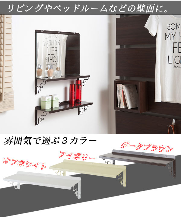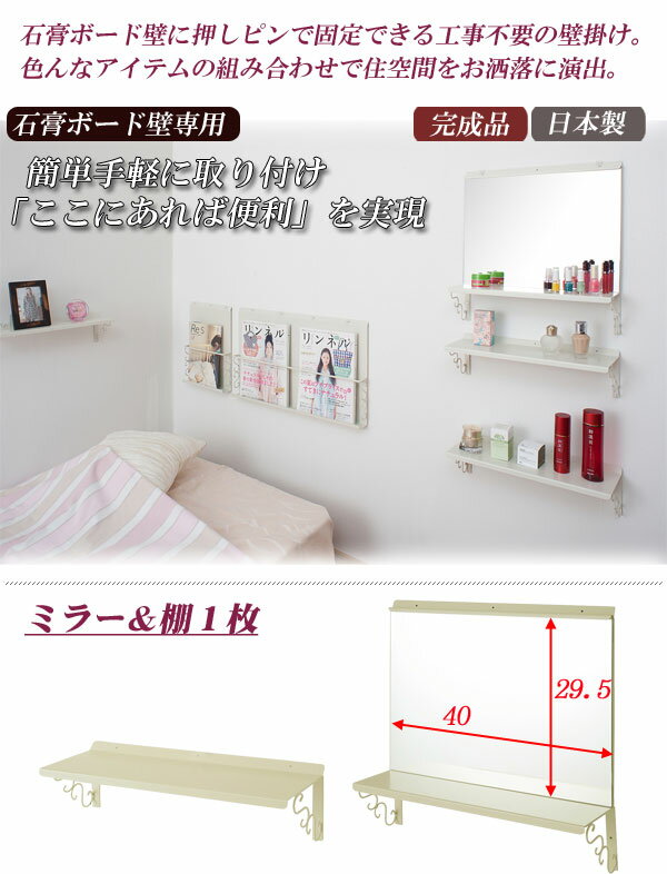 ■商品について 石膏ボード壁に押しピンで固定できる工事不要の壁掛け棚。色んなアイテムの組み合わせで住空間をお洒落に演出できます。好きな所に設置でき、また位置変えも簡単。壁には押しピン跡しか残らないので、修復も簡単!この便利な飾り棚と壁面にドレッサーが生まれるミラー付きがセットで新登場。カラーはオフホワイト・アイボリー・ダークブラウンの3色から。横に並べたり別のシーンで使用したりと使い方様々。他に棚板3枚組・雑誌をディスプレイできるマガジン収納タイプなどこれからは壁面をデザインする収納&ディスプレイに!破れたり汚くなった壁紙を目隠しできる効果もあります。 ■商品の仕様 耐荷重量/棚板:約2kg付属品/プッシュピン ■商品サイズ ミラー付き:(約)幅40×奥行11×高さ42cm ミラー付きの棚板部:(約)幅40×奥行9.5cm 棚板:(約)幅40×奥行13(棚面12)×高さ12cm ■材質 本体 :スチール(エポキシ樹脂粉体塗装) ■梱包サイズ 約:幅45×奥行45×高さ16cm ■配送について ●配送会社は西濃運輸です。時間指定は午前・午後のみとなります。 ●大型商品の場合、夜間配達が適用外となります。 ●日曜・祝日のお届けは、地域によりお受けできない場合がございます。 ●北海道・沖縄・その他離島は別途お見積もりになります。 ●エレベーター、階段、玄関、廊下の幅や高さによっては、搬入が困難な場合もございますので事前に搬入経路をご確認お願い致します。その為別途ケースによりまして費用が発生する場合がございますのでその点は予めご了承ください。 ※こちらの商品は受注生産品となりますので、ご注文後の不良以外での返品・交換はお受けできかねます。【重要】個人宅配のトラブル防止のため運送会社からは今後、お客様にお手伝いをしていただく事を禁止とし、 その際玄関が階段を使って上る・エレベーターなしの2階以上のお宅は別途、 追加料金が発生します(玄関渡しが原則です)家具の配送のトラブル防止の為、 運送会社の取り決めになりましたのでご了承お願いいたします。壁掛け棚シリーズ 飾り棚3枚 オフホワイト 飾り棚3枚 アイボリー飾り棚3枚 ダークブラウン ドレッサーミラー&棚 オフホワイト ドレッサーミラー&棚 アイボリードレッサーミラー&棚 ダークブラウン ディスプレイ棚 小2枚 オフホワイト ディスプレイ棚 小2枚 アイボリーディスプレイ棚 小2枚 ダークブラウン ディスプレイ棚 大2枚 オフホワイト ディスプレイ棚 大2枚 アイボリーディスプレイ棚 大2枚 ダークブラウン
