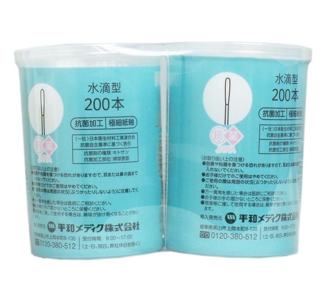 個装サイズ:120X83X60mm個装重量:約115g内容量:200本×2個入製造国:ベトナム【発売元:平和メディク】【綿部】材質・・・コットン100%色・・・白大きさ・・・極小形状・・・水滴型+水滴型【軸】材質・・・紙色・・・白太さ・・・細め 【キトサン抗菌加工】綿球表面【お取り扱い上の注意】・鼓膜や粘膜を傷つける恐れがありますので、耳または鼻の奥まで入れないでください。・お子さまだけでのご使用はやめてください。・ご使用の際は周囲の状況に注意してください。・万一異常を感じたら医師にご相談下さい。・お子さまの手の届かないところに保管して下さい。・溶液等に浸して使用する場合は綿球が抜けやすくなることがあります。【商品詳細】大切な赤ちゃんのために様々な用途で使える、便利な極細綿棒です。●形状は両側水滴型です。●容器はシンプルでスマートな円筒容器です。●綿球表面はキトサン抗菌加工です。●2個パックです。※メーカーの都合によりパッケージ、内容等が変更される場合がございます。当店はメーカーコード(JANコード)で管理をしている為それに伴う返品、返金等の対応は受け付けておりませんのでご了承の上お買い求めください。【送料について】北海道、沖縄、離島は送料を頂きます。個装サイズ:120X83X60mm個装重量:約115g内容量:200本×2個入製造国:ベトナム【発売元:平和メディク】【綿部】材質・・・コットン100%色・・・白大きさ・・・極小形状・・・水滴型+水滴型【軸】材質・・・紙色・・・白太さ・・・細め 【キトサン抗菌加工】綿球表面【お取り扱い上の注意】・鼓膜や粘膜を傷つける恐れがありますので、耳または鼻の奥まで入れないでください。・お子さまだけでのご使用はやめてください。・ご使用の際は周囲の状況に注意してください。・万一異常を感じたら医師にご相談下さい。・お子さまの手の届かないところに保管して下さい。・溶液等に浸して使用する場合は綿球が抜けやすくなることがあります。【商品詳細】大切な赤ちゃんのために様々な用途で使える、便利な極細綿棒です。●形状は両側水滴型です。●容器はシンプルでスマートな円筒容器です。●綿球表面はキトサン抗菌加工です。●2個パックです。
