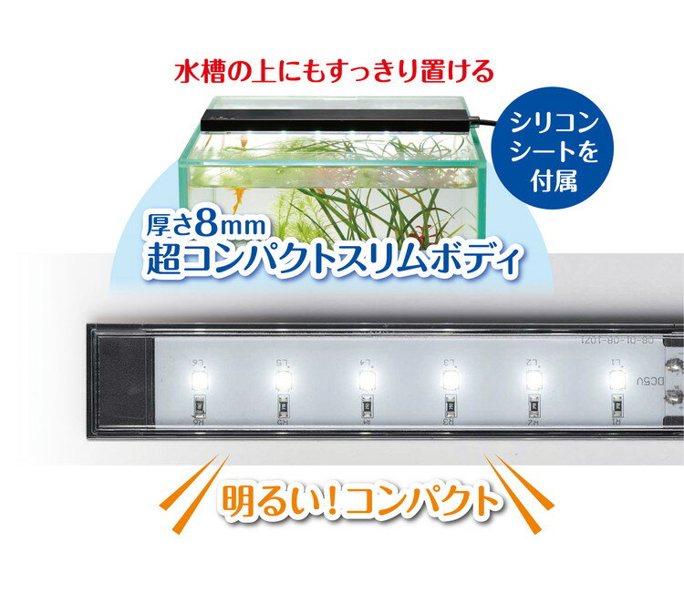 【取り寄せ品のご注意事項(ご注文前にご確認ください)】・本商品は原則注文後のキャンセルはお受けできません。・本商品と他商品で同梱注文をいただき、仮に他商品が完売等でご用意できない場合でも本商品は発送させていただきます。・本商品を複数(2点以上)注文いただき、完売等で注文数のご用意できない場合でもご用意できた数量は発送させていただきます。【商品説明】コンパクトで明るいスリム高輝度LED・どんな水槽にフィットする薄型でコンパクトなLEDです。・高輝度SMDLED採用。自然な明るさで魚や水草を美しく魅せる。・水槽のフタに置いてもすべりにくいシリコンシート付・フレームレス水槽、枠付水槽に対応・専用フタ「アクアカバー」(別売)に、フラットにセットできる。【商品詳細】・メーカー名ジェックス株式会社・材質PS・商品使用時サイズ幅14.6×奥行2.5×高さ0.8cm(本体部のみ)コード長:約1.5m(中間スイッチ含む)【送料について】北海道、沖縄、離島は送料を頂きます。