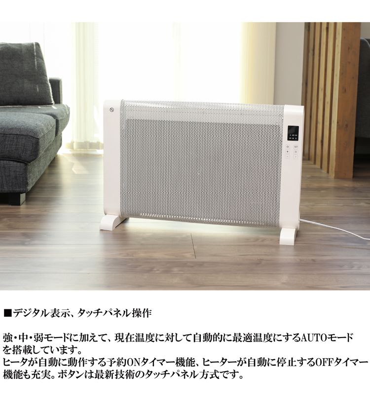 【商品説明】〈熱伝導の高いマイカ式のパネルヒーター〉風を巻き起こすことがないため、お部屋にホコリが溜まったり空気が乾燥することがありません。ヒーター部分のマイカ(雲母)から直接放射される放射熱と、輻射熱の発生でお部屋をじんわりと暖かくしてくれます!〈リモコン付き〉ソファに座った状態や離れた場所からでも操作が可能です。〈デジタル表示・タッチパネル表記〉現在温度に対して自動的に最適温度になるオートモードを搭載しています。ヒーターを自動的に操作する予約オンタイマー機能と、自動に停止するオフタイマー機能もついております!ボタンは最新技術のタッチパネル方式!〈安心・安全〉サーモスタットコントロール機能で最適な温度を自動で検知。万が一、転倒時には電源が自動的にオフになる転倒時安全機能が備わっています!【商品詳細】サイズ:約W765*D230*H500mm重量:約5kgパッケージサイズ:約W810*D135*H550mmABS樹脂、スチール〈製品仕様〉電源電圧AC100V定格周波数50/60Hz定格消費電力強1000/中600/弱400W暖房目安約8畳機能強・中・弱・自動モード、本体結露防止モード(7℃)安全装置転倒時自動オフ、サーモスタット65℃、電流ヒューズ12.5Aタイマー設定範囲0.5〜24.0時間保証期間:1年間【代引きについて】こちらの商品は、代引きでの出荷は受け付けておりません。【送料について】北海道、沖縄、離島は送料を頂きます。
