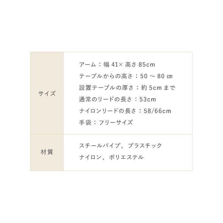 ■特長・ご自宅のテーブルがトリミング台になる便利なトリミングアームセット・5cm厚までのテーブルに設置可能です・アームは50cmから80cmまで無段階に高さを調節できます・撫でるだけで抜け毛ケアできるグルーミング手袋が付属します■サイズ(約)アーム:幅41×高さ85cmテーブルからの高さ:50〜80cm設置テーブルの厚さ:約5cmまでリードの長さ:53cmナイロンリードの長さ:58/66cm手袋:フリーサイズ■素材スチールパイプ、プラスチック、ナイロン、ポリエステル※サイズには若干の差がございます。※商品の仕様は予告なく変更になる場合がございます。※商品の色味はモニターの機種や設定により実際の商品と異なる場合があります。予めご了承ください。※生産ロットにより、同じカラーでも多少の色差があることがございます。ご了承ください。【特長】ペット、トリミングアームセット、ポータブルトリミングテーブルアーム、外付けアーム、トリミング台、2種リード付き、トリミング、トリマー、犬用、グルーミング、カット、ブラッシング、折りたたみ、コンパクト、7点セット、グルーミング手袋【送料について】北海道、沖縄、離島は送料を頂きます。ペットケア用品折りたたみトリミングテーブル 幅60cm折りたたみトリミングテーブル 幅60cm ドライヤースタンド付き折りたたみトリミングテーブル 幅81cm折りたたみトリミングテーブル 幅81cm ドライヤースタンド付き折りたたみトリミングテーブル 幅120cm昇降式トリミングテーブル 幅60cmトリミングチェアトリミングチェア 背もたれ付きトリミングアームセットドライヤースタンドバリカン