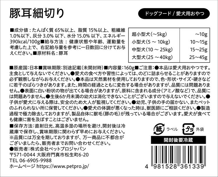 【4個セット】 ペットプロ 国産おやつ 無添加 豚耳細切り 160g 国産 日本製 犬用 犬 おやつ スナック ジャーキー 豚耳【送料無料】