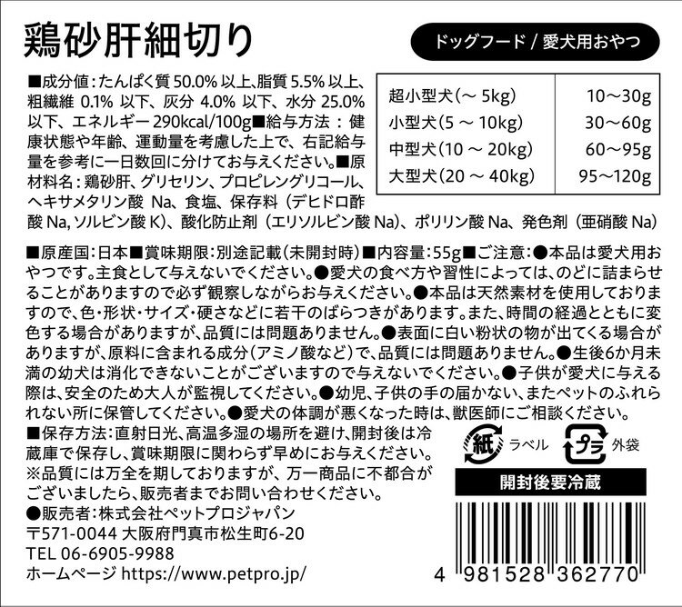ペットプロ 国産おやつ 鶏砂肝細切り 55g 国産 日本製 犬用 犬 おやつ スナック ジャーキー 砂肝