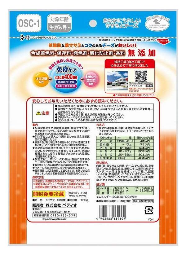 【商品説明】・低脂肪な鶏ササミとコクのあるチーズがおいしいおやつです!・2種類の乳酸菌(ナノ型乳酸菌KH-2株・有胞子性乳酸菌)を10本に約400億個配合!さらに、オリゴ糖、食物センイ(難消化性デキストリン)配合で、おなかの健康維持に!・合成着色料・保存料・発色剤・酸化防止剤・香料といった気になる添加物をカットしました。・小型犬・シニア犬にも与えやすい。○原材料肉類(鶏・鶏ササミ)、卵類、チーズ、でんぷん類、小麦粉、パン粉、乳製品、食塩、酵母エキス、難消化性デキストリン( 水溶性食物繊維)、オリゴ糖、乳酸菌(KH-2株(熱処理済)・ラクリス)、加工でんぷん、グリセリン、プロピレングリコール、炭酸Ca、pH調整剤、カゼインNa、リン酸塩(Na)、着色料(紅麹)○賞味/使用期限(未開封)365日※仕入れ元の規定により3ヶ月以上期限の残った商品のみ出荷致します○保管方法・直射日光・高温多湿の場所をさけて保存してください。・開封後は必ずチャックを閉じて冷蔵庫で保存し、賞味期限に関わらずなるべく早くお与えください。○原産国日本○メーカー名株式会社 ペティオ【取り寄せ品のご注意事項(ご注文前にご確認ください)】・本商品は原則注文後のキャンセルはお受けできません。・本商品と他商品で同梱注文をいただき、仮に他商品が完売等でご用意できない場合でも本商品は発送させていただきます。・本商品を複数(2点以上)注文いただき、完売等で注文数のご用意できない場合でもご用意できた数量は発送させていただきます。【送料について】北海道、沖縄、離島は送料を頂きます。