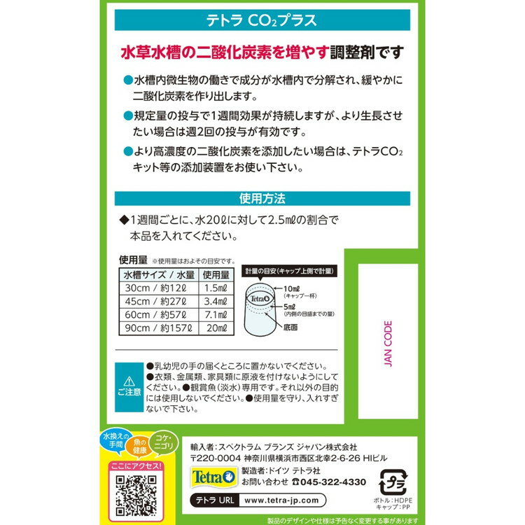 【商品説明】・水草水槽のに二酸化炭素を増やす調整剤です。・水槽内の微細物の働きで成分が水槽内で分解され、緩やかに二酸化炭素を作り出します。・規定量の投与で1週間効果が持続しますが、より生長させたい場合は週2回の投与が有効です。○材質水、他○諸注意・幼児の手の届く所に置かないでください。・衣類、金属類、家具類に原液を付けないようにして下さい。・観賞魚(淡水)専用です。それ以外の目的には使用しないでください。・使用量を守り、入れすぎないでください。○メーカー名スペクトラムブランズジャパン株式会社【取り寄せ品のご注意事項(ご注文前にご確認ください)】・本商品は原則注文後のキャンセルはお受けできません。・本商品と他商品で同梱注文をいただき、仮に他商品が完売等でご用意できない場合でも本商品は発送させていただきます。・本商品を複数(2点以上)注文いただき、完売等で注文数のご用意できない場合でもご用意できた数量は発送させていただきます。【送料について】北海道、沖縄、離島は送料を頂きます。