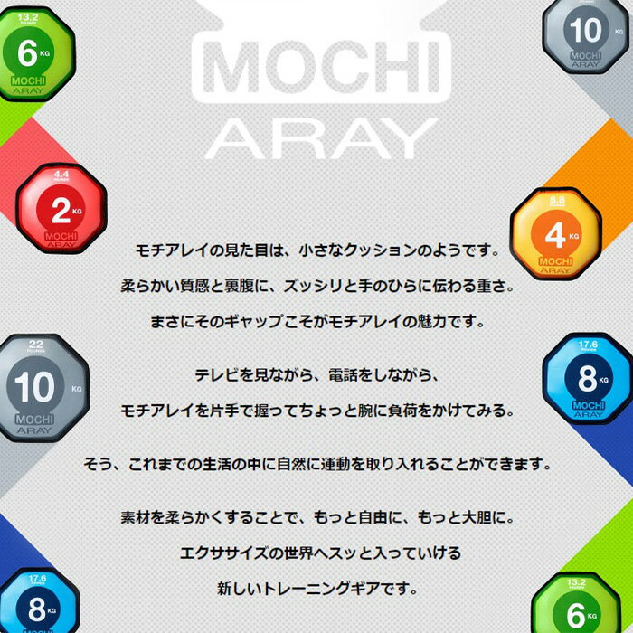 つかんだり挟んだり、あるいは投げてみたりと、鉄アレイでは難しかったトレーニングが可能になります。 プロのアスリートのニーズにも応える、全く新しいトレーニングギアです。 クッションのような柔らかさと、ずっしりとくる重さの両方を実現。 床に落としても、傷はつかない音も少ない。自宅でのトレーニングにぴったりです。 また、ポップな見た目とは裏腹に、つかむ、挟む、投げる等、ダンベルではできないトレーニングもモチアレイなら可能です。 ビギナーからアスリートまで、幅広く使っていただけます。 重さのバリエーションは、2kg、4kg、6kg、8kg、10kgの全部で5種類。 こちらは2kgの商品です。 子供から大人まで自分にあった重さを選びましょう!