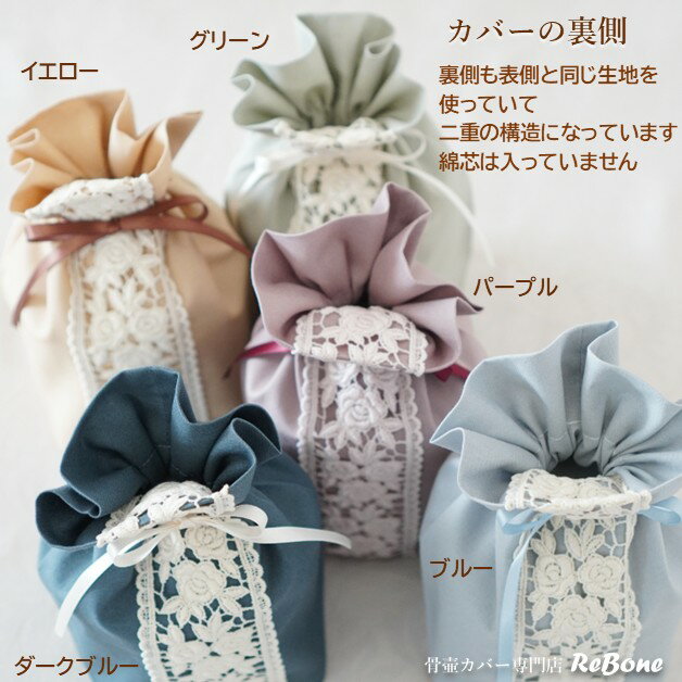 商品説明 市販の3寸骨壷用カバーです。 素材・付属品 布、レース、リボン等 サイズ 幅約12cm×奥行約12cm×高さ約18cm(骨壷を納めた状態) 備 考 ※国産手作りです。 ※市販の骨壷サイズ3寸用です。 直径9.8cm 高さ11cm 程度の骨壷が入ります。 ※骨壷は商品に含まれません。3寸用 骨壷カバー 送料無料 「コットンローズ」シリーズに骨壷をそのまま入れるタイプの総裏地カバーが完成しました。 六角骨袋用のカバーと同じデザインですが、骨壷を直接入れるタイプのカバーとなります。 カバーの内側は表側と同じ生地を使い二重になっています。 カバーの後ろからリボンを引っ張り、前側に持って来てリボン結びをしてください。 骨壷を中に納めたら、カバーの口を開いて形を整えてください。 ※市販の骨壷サイズ3寸用です。 直径9.8cm 高さ11cm 程度の骨壷が入ります。 ※骨壷は商品に含まれません。 お客様都合による返品・交換は出来ません。サイズをご確認の上、お買い求めください。 お名前や日付を入れたい方はネームシール、ネームリボンのページからご注文ください。 ネームシール ネームリボン 骨壷製造メーカーに寄り骨壷のサイズが微妙に異なるため、カバーは少し大きめにお作りしています。 カバーのゆるみや滑りが気になる場合は、フィットカバーがお勧めです。 フィットカバー