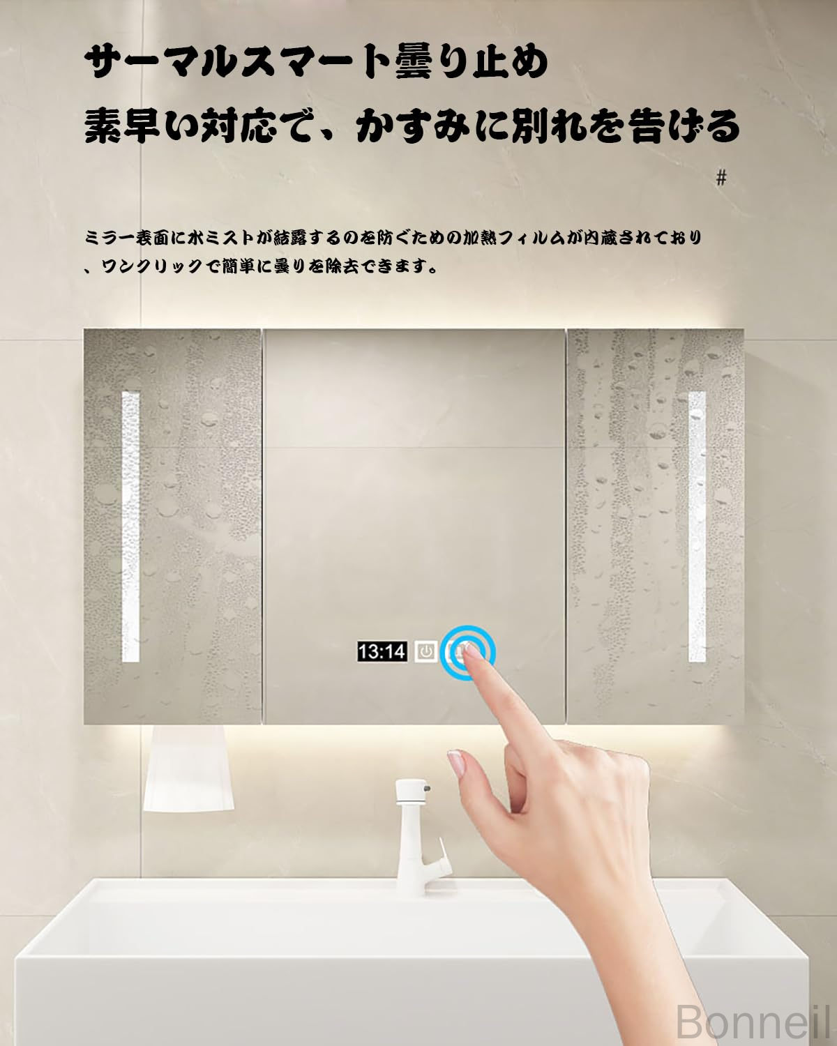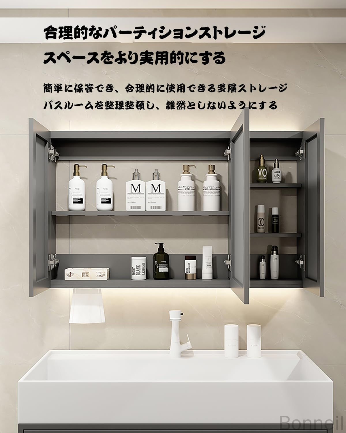 A-上下ライト付き+左右ライト付きB-上下ライト付き? 【環境に優しいデザインと多機能】:ミラーキャビネットは飛散防止ガラスを備えたスペースアルミニウム素材で作られており、ホルムアルデヒドの放出を最小限に抑え、より高い安全性を確保し、バスルーム環境に適しています。 安全機能に加えて、ティッシュボックススロット、化粧品陳列エリア、ペンダントエリアなども利便性を高め、バスルームの整理整頓と快適性を高めます。? 【3つの明るさ調整可能】このバスルームミラーはフルタッチコントロールが付属しており、短く押すと色温度を暖色(3000K)、自然(4500K)、白(7000K)に自由に切り替えることができます。 このLEDメイクアップミラーは、メイクアップ、スキンケア、シェービング、ドレッシングの際に、より良い体験をもたらします。 時間指定もあります。? 【ワンタッチ曇り止め】除湿ボタンをタッチするとデフォッガーが起動します。 ミラーの中央には1200cm?の加熱プレートが装備されており、除湿温度に達するまで5〜10分かかり、水蒸気を除去し、高解像度の画像と鮮明な反射を確保します。 除湿ボタンと照明スイッチは別々に操作できるので安全で省エネです。? 【高品質素材】当社のバスルームミラーキャビネットはCRI 90+の高品質光源を使用しており、完璧なメイクアップとスキンケアルーチンを提供します。 110° ヒンジは鏡や大きな薬品棚の重量をよりよく支えます。 5mmの銅を含まないシルバーミラーは、湿気や家庭用化学物質による腐食から保護します。? 【取り付け簡単】見た目ほど複雑ではなく、ミラーキャビネットは完全に組み立てられた状態でお届けしますのでご安心ください。 組み立て時に引っかかる心配もありません。 パンチで穴を開けて壁に掛けるだけです。 ご質問がございましたら、お気軽にお問い合わせください。24時間以内に返信させていただきます。 指定された配送時間は承っておりません。【Bonneil】