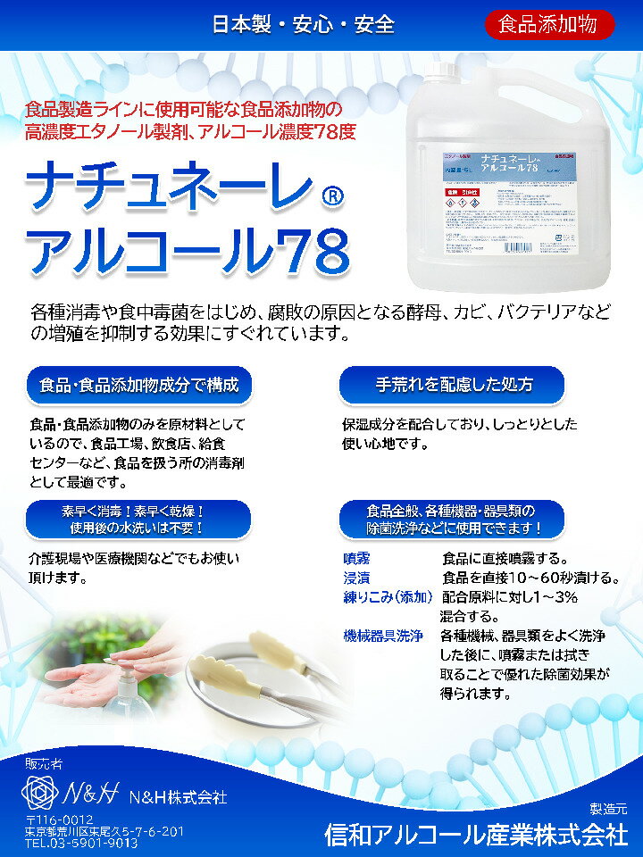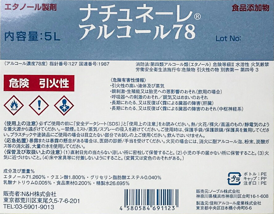 信和アルコール産業製 ナチュネーレ アルコール78 5L【消毒用】エタノール 消毒用 業務用 エタノール消毒液 消臭・抗菌 ウイルス対策 除菌消臭スプレー 防止 安心 アルコール濃度78%含有 日本製 洗浄 洗浄剤 掃除 除菌剤 清掃 清潔 手指消毒 除菌 消毒 ウィルス アルコール除菌 ナチュネーレ アルコール78◆手の消毒、食品全般、各種機器・器具類の除菌洗浄など。◆99%濃度の植物性アルコール使用◆食品に直接かけられるアルコール。◆あらゆる用途にも使えます。【商品仕様】◆サイズ:横幅23×奥行14×高さ25.5cm◆アルコール濃度:78%◆成分及び重量:エタノール71.260%、クエン酸1.800%、グリセリン脂肪酸エステル0.040%、乳酸ナトリウム0.005%、食品素材0.200%、精製水26.695%◆製造販売元:信和アルコール産業株式会社◆生産国:日本◆容量:5L◇使用方法◇◆食品に直接噴霧する。◆各種機器、器具などを良く清掃した後、噴霧または拭き取る。◆手洗い後の手に塗り(スプレー)して擦り込む。◆脱脂綿、ガーゼ等に染み込ませて皮膚の汚れをふき取る。【使用上の注意!】※深い傷やひどいやけどなど、患部が広範囲に広がっている方は使用しないでください。症状が悪化したり、副作用が起こりやすくなる可能性があります。※発疹や赤み・かゆみが出た場合は直ちに使用を中止し、使用した商品を持って医師又は薬剤師へ相談してください。※アルコール濃度が高い為火気には絶対に近づけないでください。※品質が変わったり、誤用の原因になりますので他の商品の容器に入れ替えないでください。 2