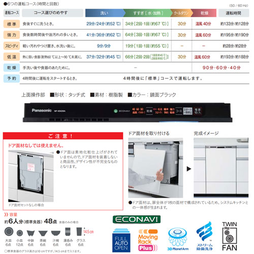 【セット内容】 ・本体 【ドア面材型について】 ドア面材型、ドアフル面材型の商品は化粧パネルを取付けないと使用出来ません。 別売の化粧パネルをご用意ください。 ※イメージ画像は別売パネルをセットしている場合がございます。 また、形状によっては既設の化粧パネルを転用できない場合もあります。 システムキッチンの化粧パネル(別売品)との組み合せなどご不明な点は、お気軽にご相談下さい。 【規格・特徴】 ・外形寸法:幅448×奥行609×高さ753〜853mm ・質量:本体25kg/脚ユニット2kg ・フルオートオープン ・ディープタイプ ・タイプ:ドアフル面材型※買替え・後付けには条件があります。 ・ちょこっとホルダー ・洗えるまな板の最大寸法(mm):横410×縦220×厚み15 ・食器点数:48点(約6人分) ・庫内容積:約60L ・下部収納キャビネット:取付不可 【操作部カラー】 ・鏡面ブラック 【機能】 ・運転コース:6コース(低温/標準/強力/スピーディ/予約/乾燥) ・予約:4時間後の運転開始 ・オートドライキープ ※乾燥終了後、室温に応じて80〜120分、ヒーターを入れずに送風と停止を繰り返します。 【適合キッチン】 奥行:65cm以上 高さ:800〜900mm 間口:225cmぐらいから 【商品説明】 美観と先進性を高度に兼ね備えたハイエンドモデル。 ドアを2回ノックすれば、引き出さなくてもフルオートオープン。 食器をフルセットしていても、力はいりません。 ※閉じる際は手動になります。 ドア面材なしではご使用できない商品です。新規設置のシステムキッチン等と合わせてご準備下さい。 食器洗乾燥機 フルオートオープン ツインファンベント プラネットアームノズル ストリーム除菌洗浄 エコナビ ムービングラック ちょこっとホルダー 4月食洗機 ドア面材型パナソニックNP-45KD9A