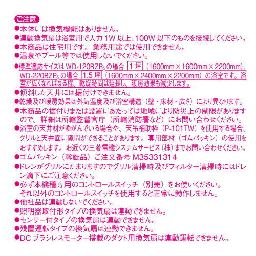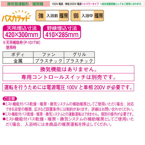 【規格・特徴】 ・単相200V ・暖房/乾燥用PTCセラミックヒーター搭載 ・フラットパネル採用 ・涼風機能 ・循環ファンによる涼風効果(夏期) ・温度過昇防止用サーミスタ/ヒューズ内蔵 ・最大12時間「入・切」タイマー ・配線容易[コントロールスイッチはコネクターワンタッチ接続(本体側電源2芯/アース1芯/コントロールスイッチ3芯)] ・速結端子接続 【サイズ】 ・天吊埋込寸法:420×300mm ・野縁埋込寸法:410×285mm ・接続パイプ:φ100mm ・本体質量:7.0kg 【別売品】 「換気扇連動用」 ・P-121SW5 ・P-121SW5-T(照明スイッチ取付可※お客様手配) 「暖房機用」 ・P-123SW5 ・P-123SW5-T(照明スイッチ取付可※お客様手配) ※コントロールスイッチは別売です。上記リモコンを別途ご用意ください。 【付属品】 ・コントロールスイッチ接続コード(有効長約5m) 【メーカー直送便の注意事項】 下記の条件がございますので、商品によってはご準備くださいますようお願い致します。 ※別途金額が発生する場合がありますので必ずご一読ください。 ■商品お渡しについて 基本ドライバー1人で訪問の為、荷下ろしの際にお手伝いできる方が必要となります。 集合住宅の場合は1階及びエントランス、戸建住宅の場合は玄関先でのお引き渡しとなります。 ■配送車について 一般的な宅配業者でございません。メーカー指定の大型トラック(4t車)にての配送となります。 道幅6m(一般的な軽自動車がすれ違える道幅)以下の場合、配達ができません。 別途追加料金が発生いたしますが、2tトラックでの手配が可能です。 階段、狭所など困難な場合はご相談ください。 ■商品お届け日について メーカーに在庫があり、日にち指定がない場合は、翌日、または翌々日のお届けとなります。ご希望日がありましたらご注文フォームの「お届け日時」にご記入ください。(平日のみ) 納期要確認の記載のある商品や受注生産商品の場合、納期にお時間が掛かります。詳細な納期については商品により異なりますので、改めて当店よりご連絡させて頂きます。 ■お届け時間について 時間指定が出来かねます。必ず連絡が取れる電話番号と荷受人のお名前を記載ください。 当日の配送時間(目安)については、配送前にドライバーよりご連絡させて頂きます。 (配送前連絡はサービスとなりますので確約するものではございません) ■不在時の再配達について 不在の場合は運送会社が持ち帰り、当日の再配達が出来かねます。 また保管料・再配達の手数料が発生する場合(お客様負担)がございますのでお届け日には必ずご在宅いただけますようお願い致します。 ■配送エリアについて 沖縄・離島地域の場合、別途費用がかかる場合がございます。 ■お支払い方法について 「後払い」「クレジットカード」「銀行振込」「郵便振替」のみとなります(代金引換は不可)。 ご入金確認後にメーカーへ発注させていただきます。 【大型商品の配送について】 ■基本ドライバー1人で訪問の為、荷下ろしの際にお手伝いできる方が必要となります。 ■大型トラック(4t車)にて配送となります。 道幅6m(一般的な軽自動車がすれ違える道幅)以下の場合、配達ができません。 ※別途追加料金が発生いたしますが、2tトラックでの手配が可能です。 階段、狭所など困難な場合はご相談ください。 ■時間指定が出来かねます。 その為、必ず連絡が取れる電話番号と荷受人の名前を記載ください。 当日の配送時間(目安)については、配送前にドライバーよりご連絡させて頂きます。 P-120SW5 P-120SW5-T P-121SW5 P-121SW5-T 2022年6月発売 浴乾 バス乾燥・暖房・換気システム三菱電機WD-220BZR5