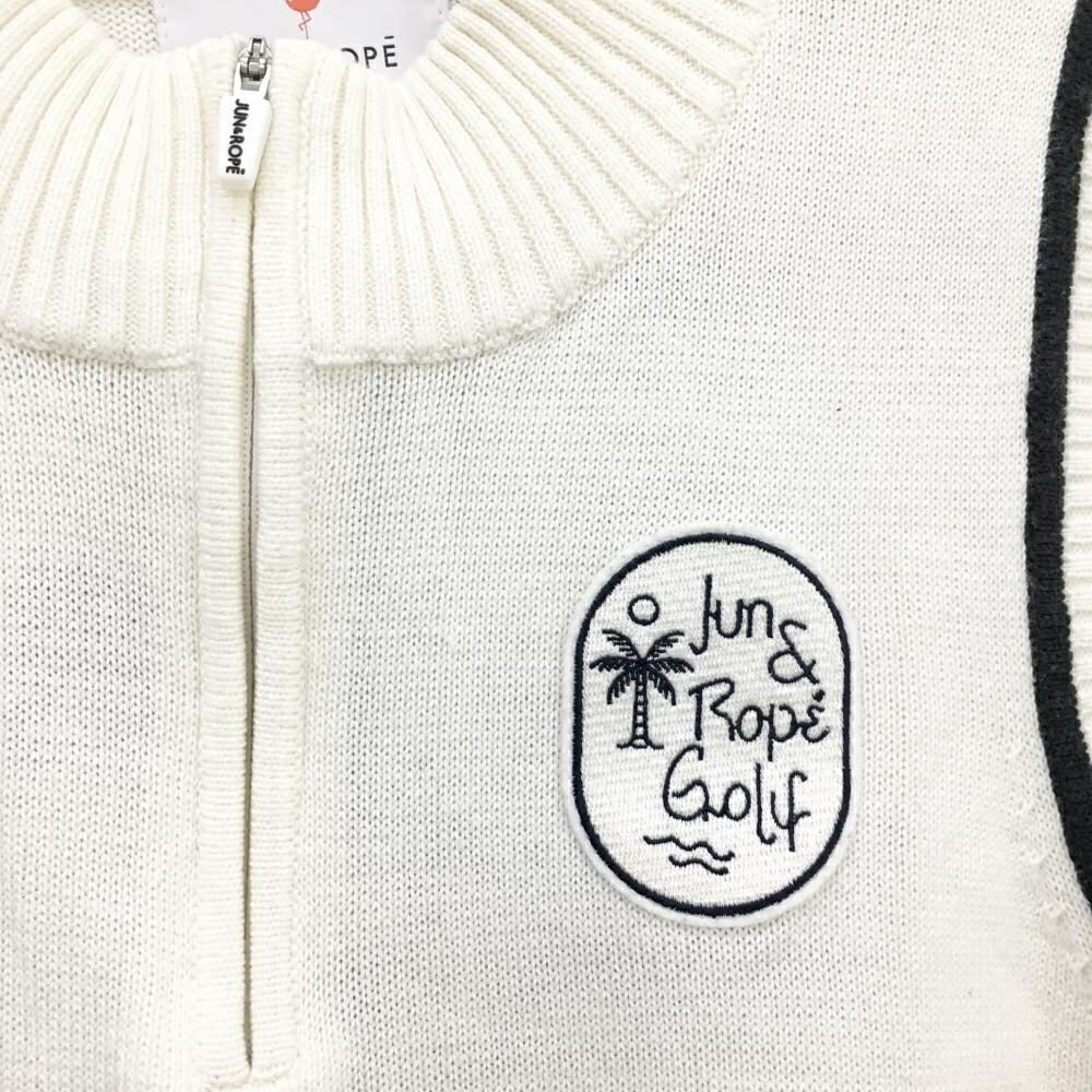 【美品】ジュンアンドロペ ニットベスト 白×ネイビー ハーフジップ 後ろビッグロゴ レディース L ゴルフウェア JUN&ROPE