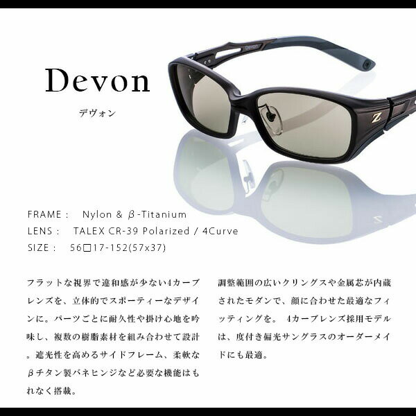 【タクティカル眼鏡ケースプレゼント】 ゼクーのサングラスをもっと釣りに活用していただく為のプレゼント企画! ゼクーのサングラス購入者様全員にバッグやベストなど、 どこでも取り付け可能な当店オリジナルタクティカル眼鏡ケースをプレゼント。 おすすめポイント ・サングラスをいつでもどこでも取り出せる。 ・セミハードケースで衝撃に強い。 ・ライニング(内側)はウレタンシートを配置し保護力を高めています。 ・500デニールの耐久性抜群のファブリック。 ご注文の際に眼鏡ケースカラーをお選びください。 ----------------------------------------------------------Devon原点回帰で新たに生まれた機能性溢れるスタンダード。視界の違和感が少ない4カーブレンズを、立体感のあるスポーティーなデザインに。パーツごとに耐久性や掛け心地を吟味し、複数の樹脂素材を組み合わせて設計。遮光性を高めるサイドフレーム、柔軟なβチタン製バネヒンジなど欲しい機能を搭載。調整範囲の広いクリングスや金属芯が内蔵されたモダンで、顔に合わせた最適なフィッティングを。【最高品質の日本製偏光レンズ】: ただ暗く光を遮るサングラスとは異なり、見えていなかったディテールまで、より鮮やかに。強い陽射しなどの自然光の眩しさを和らげながら、有害な紫外線やギラつく反射光をカット。アウトドアやフィッシングでは水面や雪面の乱反射を、ドライブでは路面の照り返しやフロントガラスの映り込みなど様々な反射光を抑え、高性能な偏光フィルターが目に優しい光だけを通す。明るく見えるのに眩しくない鮮明な視界。有害な紫外線を99%以上ブロック。FRAME MATERIAL ナイロン&β-チタンFRAME SIZE 56□17-152(57×37)LENS MATERIAL TALEX(タレックス)CR-39偏光レンズLENS CURVE 4カーブ ※写真の色と実際の商品の色は多少異なる場合がございます。 ※商品画像はメーカー提供のサンプル画像です。 製品仕様・デザインは改良のため予告なく変更される場合がありますのでご了承ください。 正規品 未使用新品 当店のブランド商品は全て本物です。安心してショッピングをお楽しみください。