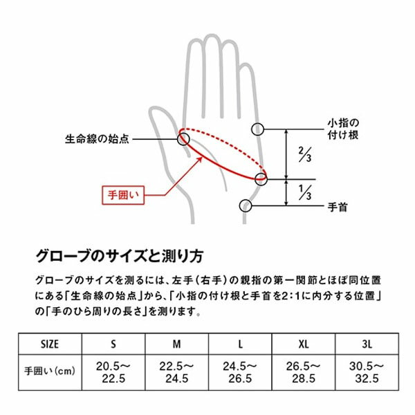 WP WINTER GLOVE(WP ウィンターグローブ)商品コード : PGV-047防寒で防水、透湿機能を併せ持った快適グローブ!!フルフィンガーで寒い時期に味方してくれるグローブです。掌のアマーラ(人口皮革)は強度がありながら柔らかく、フィット感を高めます。掌の滑りやすい箇所と中指、ひとさし指、小指にはニューパワーグリップを配置しグリップ力を上げました。手首はマチ付き止めでフィット感をアップ。グローブ内部はマイクロフリースで柔らかく保温性に優れています。快適な釣りに手放せない一品です。- ご注意 -※生地(特に化繊部分)や面ファスナーなどパーツ類の劣化、破損の原因となりますので高温や長時間の乾燥機のご使用はお控えください。※洗濯については手洗いが推奨です。洗濯機をご使用の際は洗濯ネットに入れて弱洗いでの洗濯をお願いいたします。甲 側:ポリエステル92% ポリウレタン8%掌 側:ナイロン60% ポリウレタン40%パーツ:ニューパワーグリップ0.7mmカラー:ブラック ※写真の色と実際の商品の色は多少異なる場合がございます。 ※商品画像はメーカー提供のサンプル画像です。 製品仕様・デザインは改良のため予告なく変更される場合がありますのでご了承ください。 正規品 未使用新品 当店のブランド商品は全て本物です。安心してショッピングをお楽しみください。