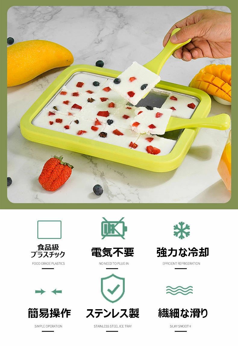 【夏の必須ツール】アイスクリームロールメーカーは、おいしいアイスクリームを作るだけでなく、幸せなアイスクリームタイムも楽しめます。【ステンレススチール】アイスクリームメーカーパンは食品グレードのステンレススチール製で、約26cmx21cmx3.5cm。【ヒント】ロールアイスクリームメーカーには強力な冷却液が付属していますので、レシピを開始する前に完全に凍らせる必要があります。マシンを冷蔵庫に入れて約10時間凍らせてください。24時間冷やすとさらに良くなります。【アイスクリームローラープレート】数分でアイスクリームを作成します。アイスクリーム、フルーティーなシャーベット、またはおいしい冷凍おやつを作る予定がある場合でも、アイスクリームパンは幅広い好みを満足させることができます。【使いやすい】このアイスクリームロールマシンは簡単に使用でき、小さなお子様でも簡単に行うことができます。電気は必要ありません。 鍋に混ぜた材料を注ぎ、アイスクリームが形成されるまでスクープして回すだけです。 スクレーパーを使用して、美しく美味しいロールアイスクリームを作ります。 フルーツ、ナッツ、スプリンクル、チョコレートチップを添えてください。