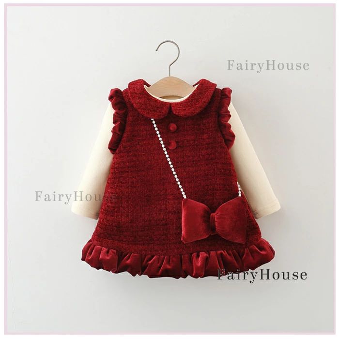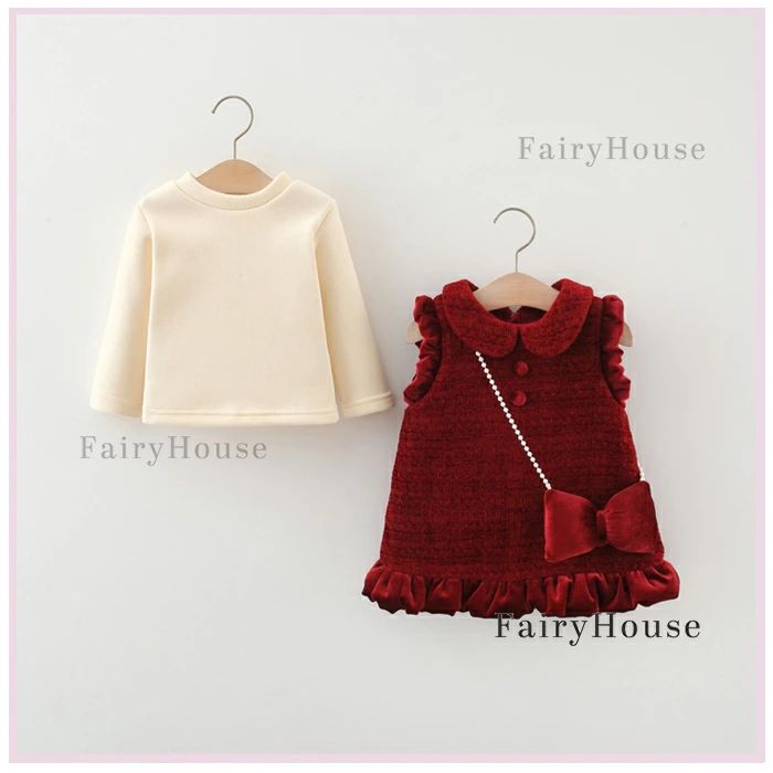 ベビー服 おしゃれ 裏起毛 普段着 プレゼント スウィート パーティー 100 誕生日 子供服 セット 冬服 2点セット ワインレッド 90 120 80 ガールズ 防寒 110 セットアップ あたたかい 発表会 長袖トップス+袖なしワンピース キッズ 通園着 子ども服 イベント 女の子
