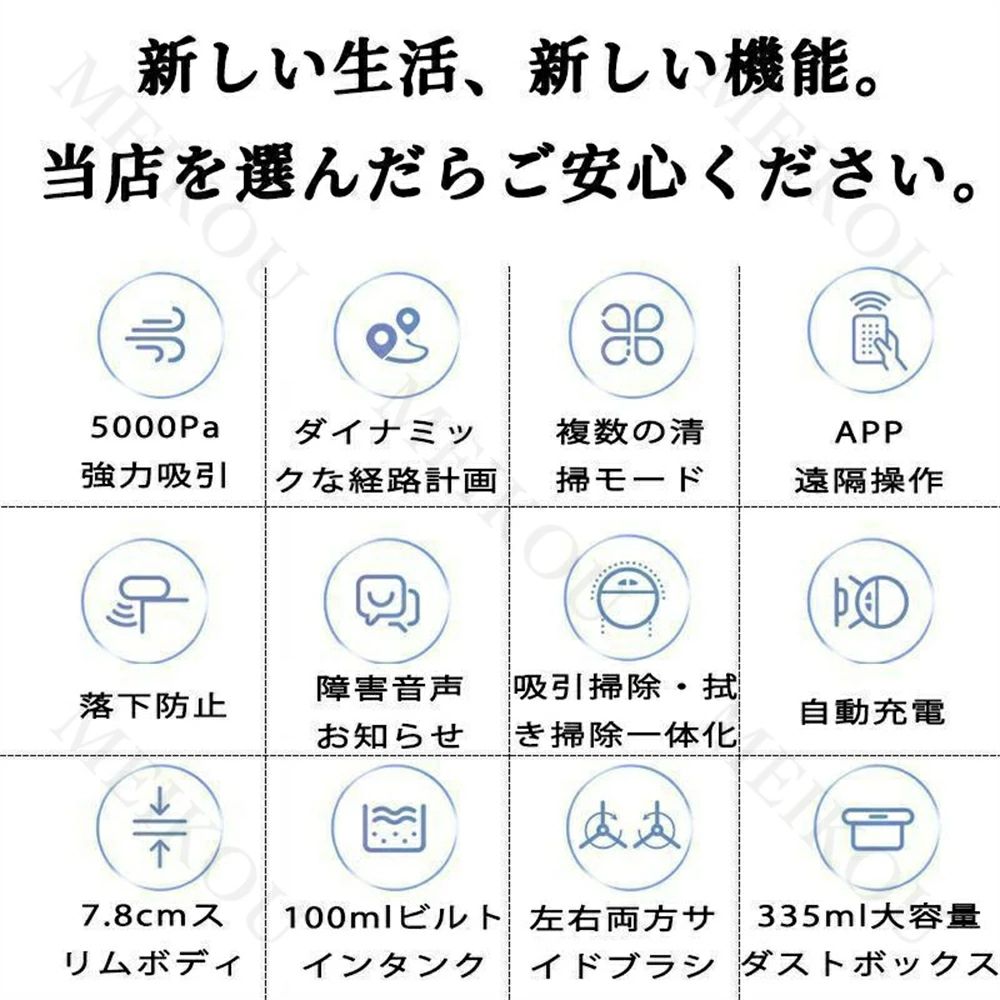 商品情報【商品】直径:300mm高さ:78mm質量:1.75kgバッテリー:5V2A電池:7.5V/3000mAh消費電力:10Wダストポックス容量:100L充電時間:5~6時間連続運転時間:2-3時間吸引力:7000PA/8500PA【約7.8cm薄型設計&700ml大容量ダストボックス】約7.8cmの超薄型掃除ロボットで、ソファーやベッド、家具の下など、ホコリが溜まりやすく掃除がしにくい場所でも簡単に入り込み、しっかりゴミを吸引してくれます。さらに、大容量700mlのダストボックスを搭載しており、たくさんのゴミやホコリを集めることができます。ダストボックスは水洗いが可能なので、衛生的に保てます。掃除の手間を減らし、清潔に保つのに最適です。【多機能モデル&掃除範囲制限可】掃除ロボットは、静音モード、衝突防止・落下防止センサー、自動充電、タイマー機能、乗り越え機能など、様々な便利な機能が備わっています。これらの機能により、掃除をより便利かつ効率的に行うことができます。【スマホ対応&操作が簡単】掃除機本体にWi-Fi機能を搭載しているのでスマホから本体の操作が可能です。掃除の開始・一時停止・終了をスケジュール設定可能です。掃除の手間はかけたくない、一人暮らしやペットがいる家庭向きの便利なロボット掃除機。【吸引と水拭き両用】一台二役、通常吸引と水拭き掃除は同時に行うことができます。掃除の手間がグンと減ります。【操作も簡単!APP/リモコン】ロボット型クリーナーでいろいろな賢い機能を体験できます。僅か数秒でアプリと連携でき、外出中でも、遠隔操作やスケジュール予約機能を実現できます。リモコンはもちろんすべての機能を確実に把握できます。【自動充電&長時間稼動】ロボット掃除機の電力が低下したら自動で充電ステーションに戻り、充電します。そのため、いつでもフルパワーでお掃除をしてくれます。ロボットクリーナーは満充電状態は約100分間の連続掃除、120-150m2の広い面積まで掃除可能。【多機能】シンプルなデザインでありながら多機能を実現。自動掃除、衝突防止、落下防止、静音設計などの基本機能は充実。また、予約機能でお好みの時間に自動で掃除を行えます。【操作方法】ワンタッチで操作可能、初心者でも楽に使えます。設定と遠隔操作も可能です。初めてのお掃除ロボットとして、使い勝手が簡単です。【パッケージ内容】ロボット掃除機本体×1、充電台×1、AC アダプター×1、取扱説明書*1、モップ×1、プラシ×1メーカー希望小売価格はメーカーサイトに基づいて掲載していますメーカー希望小売価格はメーカーサイトに基づいて掲載していますメーカー希望小売価格はメーカーサイトに基づいて掲載しています掃除機コードレス 5000Pa強力吸引力 強力省エネ自動充電式 水拭き両用 超薄型 スティック型 軽量 静音 強力吸引 Wifi遠隔操作 家庭用 多様なアプリ機能 自動掃除機 安い 人気ランキング 掃除機 人気ランキング ロボット掃除機 水拭き両用 超薄型 掃除機 軽くて使いやすい5000Pa 持 多様なアプリ機能 自動掃除機 床拭きロボット境界線テープ 部屋全体が死角なく清潔に保てます 5