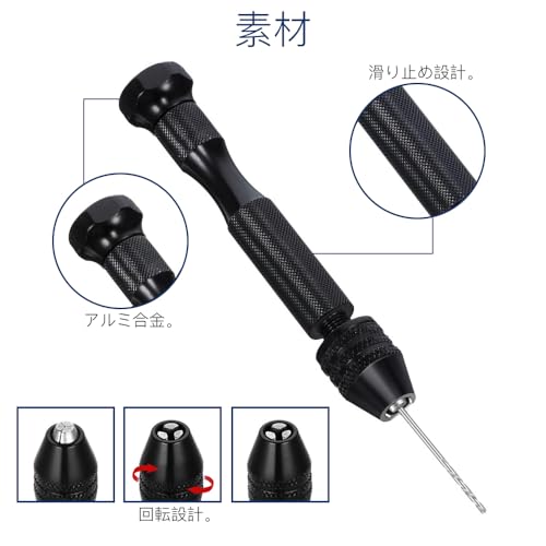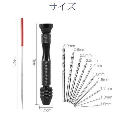 ・ブラック ・・Color:ブラック・パッケージ内容:ピンバイス*1、ダイヤモンドヤスリ*1、10種類サイズのドリル(0.8 / 1.0 / 1.2 / 1.5 / 1.8 / 2.0 / 2.2 / 2.5 / 2.8 / 3.0となります)。・優れた設計:持ち手の部分とドリル先端にローレット加工により指先の滑りを防止できます。・取付簡単:ハンドドリル先端は十字の溝が入った、先端回転によって、0.8-3mmのドリルがとりつけできます。・使い方:適合するサイズのドリル刃を選べ、ハンドドリル先端を緩める 。ピンバイスヘッドを回し、クランプ幅を適当に調整してドリルを差し込み、またヘッドを回して固定する。作業相手を固定して、ドリル頭部を手に当て、垂直に力を入れて回転すれば穴が開きます。・適用範囲:クルミ、オリーブの実、電子組立工具製造モデルを作って、ビーズ、ワイヤー、掘削木、琥珀、蜜蝋、樹脂、宝石、DIYまだ趣味の理想的な使用工具です。説明 取付簡単:ハンドドリル先端は十字の溝が入った、先端回転によって、0.8-3mmのドリルがとりつけできます。