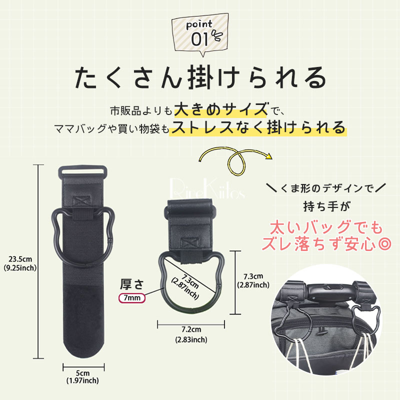 ■ おすすめ商品 ■ 商品情報商品特徴・素材【たっぷり掛けられる!くまデザインフック♪】市販品より大きめサイズ&厚み7mmでしっかり掛けられる!可愛いくま形デザインで、太い持ち手のバッグもズレ落ちにくい安心設計◎【しっかり支える10kg耐荷重!】5Lペットボトル2本もラクラク吊るせる!クロスライン補強&2.5cm幅広ベルトで安心の強度◎※ベビーカーの転倒防止のため、3kg以上は掛けすぎ注意!【取り付けカンタン!マジックテープ式】ベビーカーのパイプにくるっと巻くだけ♪幅広マジックテープでしっかり固定&ぐらつき防止◎【高級感あるエコレザー仕上げ♪】シンプルで上品なルックスにこだわったエコレザー素材。どんなベビーカーにも馴染む、ナチュラルな3色展開です。【全メーカー対応!フリーサイズ♪】特殊パーツ不要で取り付けカンタン!マジックテープ式だから、国内外どのベビーカーでもOK◎ベビーカー以外でも◎【素材】エコレザー【生産国】中国カラー・サイズ〇バリエーションブラック/キャメル/ピンク〇サイズフリーサイズ注意●生地の取り合いにより柄の雰囲気・向きが異なる場合がございます。●表記しているサイズは平置きで採寸ですので、若干の誤差が生じる場合がございます。●お客様のご覧になられますパソコン機器及びモニタなどの違い、また室内、室外での撮影により実際の商品素材の色と相違する場合もありますのでご了承下さい。●海外製品の為、縫製方法が国内生産品と異なり、糸、ほつれが見られる場合がございます。※レビュー投稿でクーポンまたはプレゼント品の送付については商品到着後、2週間以内に投稿した方が対象になります。発送について・納期は商品選択画面よりご確認ください。・予約商品の場合は発送までにお時間がかかりますのでご了承ください。【送料無料!】・配送は『ネコポス便』でお届けいたしますが、・日本郵便の発送数量が上限に達した場合、一部のご注文はヤマトメール便での発送となることがあります。包装について環境保護の観点から、「簡易包装」を推進しております。明細書について当店ではお客様の個人情報保護の観点および、環境に配慮し用紙の利用を最小限に抑えるため、ご指示の無い限り明細書を発行しておりません。 明細書を発行ご希望の場合はお手数ですがお問合せください。商品キーワード人気 洋服 服 ギフト 上品 お買い物マラソンSALE対象 セール sale 福袋 買い回り かいまわり 買いまわり 買い回りエントリー 買い周りエントリー 買い周りマラソン 2025 プチギフト ショッピング 初売りセール まだ 間に合う 1月 3月 4月 5月 6月 7月 8月 9月 10月 11月 こどもの日 子供の日 子どもの日 スーパーセール スーパーSALE 大感謝祭 大感謝祭セールsale 楽天大感謝祭 4時間限定 タイムセール 年末大感謝祭 年末★超大感謝祭 年末特別企画 年末 セール 年末年始セール 年末年始 初売り クリスマスプレゼント クリスマス 買い物マラソン おかいものマラソン お買物マラソン お買物マラソン次回 お買い物マラソンとは? タイムセール中 マラソンクーポン クーポンあり★お買い物マラソン お買い物マラソンセール 楽天お買い物マラソン 大感謝祭り 大感謝祭限定 マラソン限定 マラソン限定sale マラソンセール 楽天お買い物マラソン 1時間限定 4時間 クリスマスプレゼント クリスマス Xmas 販売開始前 楽天 12月 10% 販売期間前 スーパーセール対象商品 スーパーセール半額 スーパーセール超目玉 スーパーセール目玉商品 タイムセール 早い者勝ち 在庫処分セール 2時間限定 【RireKiitos】【Hinana】ベビーカー フック クマ バギー 軽量 新米ママ プレママ おしゃれ 荷物掛け バギーフック 熊 荷物フック 防犯 ギフト 出産祝い プレゼント コンビ ベビーカーフック 2本セット★着後レビューで特典★ バギー ペットカート くまフック 軽量 荷物掛け コンビ キャメル ブラック ピンク お出かけに!おしゃれで丈夫な荷物掛けフック。ドッグカート・ペットバギーにも! 2個セット ベビーカーフック 全4色 ベビーカー フック 出産祝い ギフト プレゼント ベビーカー クリップ おしゃれ ママ 新米ママ プレゼント 荷物掛け 荷物かけ フック ホルダー 多機能 マザーズバッグ 赤ちゃん ブラック ペット ペットバギー 愛犬 メーカー希望小売価格はメーカーサイトに基づいて掲載していますす■ おすすめ商品 ■