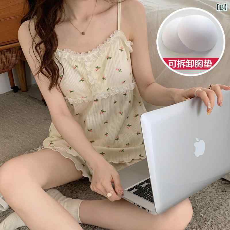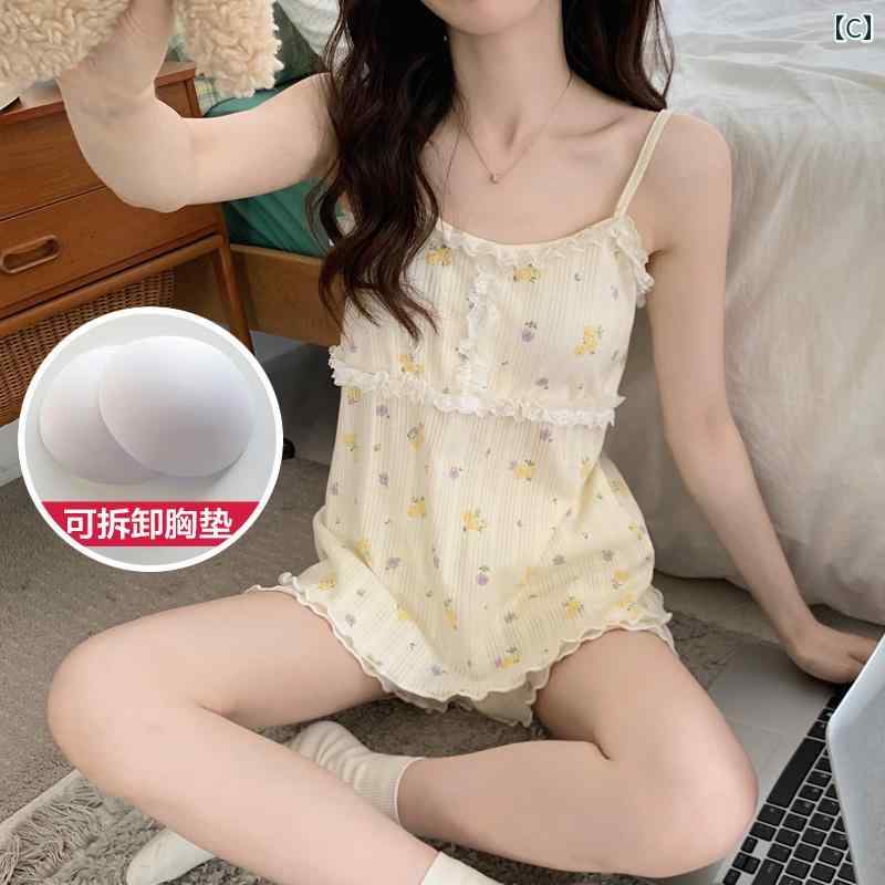 インナー レース キャミソール 2024 パッド入り サスペンダー パジャマ 女性用 夏 ベスト 花柄 ショーツ 綿 ホームウェア アウターウェア スーツ