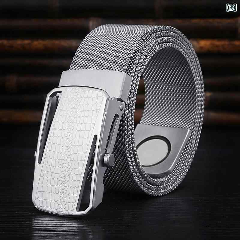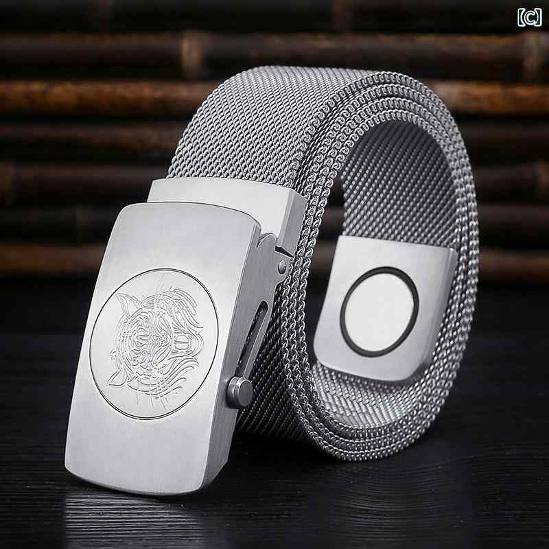 ベルト レザー メンズ メンズベルト ステンレス スチール 自動 バックル ファッション メッシュ 編み アウトドア低 刺激性 メタル パンツ ウエスト バンド