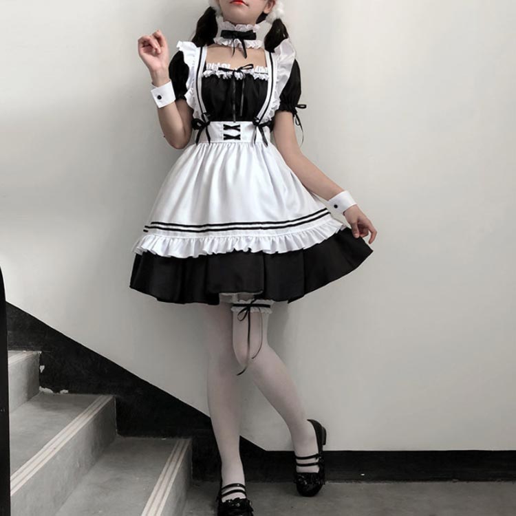 コスプレ衣装 フリル メイド服 ロリータワンピース コスチューム かわいい 女装 ロリータ 8点セット アニメ メイド服 文化祭 エプロン 仮装パーティー 衣装 イベント ハロウィン エプロン フリフリ 髪飾り付き