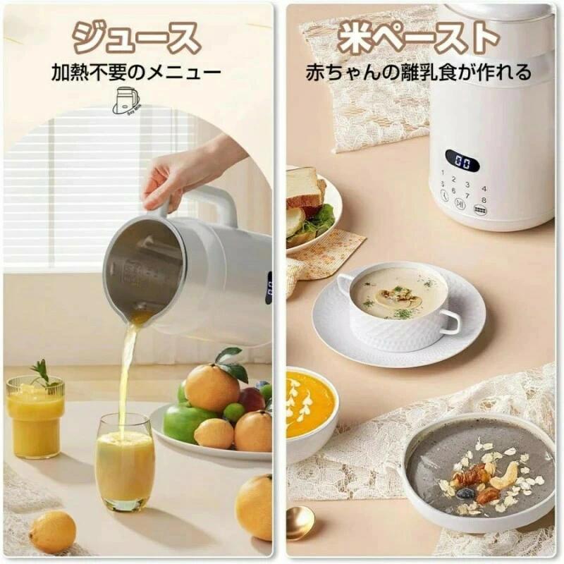 商品説明 商品詳細 【製品仕様】 本体サイズ:17.9*14.7*25.5cm 外箱サイズ:19*19*29cm ネットウェート:1.3kg グロスウェート:1.6kg 材質:フードグレードsus304+シリコンゴム+PP カラー:ホワイト セット内容:本体*1、電源アダプター*1、外国語取扱説明書、ボックス*1 【商品紹介】 操作が簡単なタッチパネル:ボタンで選べる8つの調理モード「豆乳/米ペースト/お粥/保温/とうもろこしジュース/ジュース/お湯/高温洗浄」を搭載しておりますので、大豆を水で浸けず、ワンタッチだけでさまざまなメニューに対応しています ちょうど良い容量:2-4人分の800ml(温かい飲み物)・1000ml(冷たい飲み物)というちょうど良いサイズの上、かわいらしいデザインなのでキッチンに置いておいても気になりません。使用後は水を入れてらくらく高温洗浄ボタンを押すだけで自動で洗浄してくれます 高品質なモーター:刃には、切れ味・耐久性抜群のSUS304ステンレス10本刃を採用し、優れい500W(加熱)と210W(攪拌)のパワーモーターを搭載し、フードを粉砕するときに残留物を残さず、栄養素をよりよく吸収するために小分子を放出します 24時間予約:予約設定も可能なので、好きな時にお好みのスープを楽しめます。毎朝のスムージーから、夕飯に家族でいただくスープまで、幅広いシーンと用途に対応することができます 【注意事項】 ※製品の仕様は予告なく変更されることがあります。 ※サイズは平置き実寸になります。サイズ表の実寸法は商品によって1-3cm程度の誤差がある場合がございます