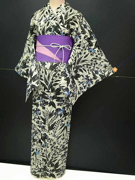 綿麻 浴衣 帯 下駄 3点セット 花火大会 お祭り 夏のお出かけ レディース 草花 生成り色 黒 紫 ブルー 現品限り e247r