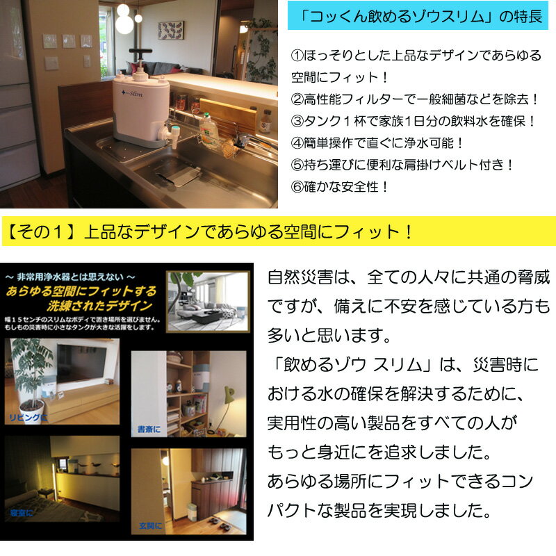 スタイリッシュ型 非常用浄水器「コッくん飲めるゾウ スリム」 非常用浄水器とは思えない。 洗練された上品なデザインで、あらゆる空間にフィット! 「飲めるゾウ スリム」は、災害時における水の確保を解決するために 実用性の高い製品をすべての人がもっと身近にを追求しました。 あらゆる場所にフィットできるコンパクトな製品を実現しました。 ・期限切れペットボトル水 ・風呂水(入浴剤入り不可) ・雨水 ・貯水タンク水 などを飲料水に浄水します。 ※別売りのシャワーで災害時に避難所や自宅でシャワーとして、普段は キャンプやレジャーなどで、おしゃれなシャワー付きウォータータンクとしても使えます。 【特徴】 ●その1 ・ほっそりとした上品なデザインで、あらゆる空間にフィット! ・高性能フィルターで一般細菌などを除去! ・タンク1杯で家族1日分の飲料水を確保! ・簡単操作で直ぐに浄水可能! ・持ち運びに便利な肩掛けベルト付き! ・確かな安全性! ●その2 特許の高性能フィルターで大腸菌、一般細菌臭いなどを除去! 高性能フィルターにより、病原細菌(大腸菌、コレラ菌、バクテリア、チフス、インフルエンザなど)、 カビ、原生動物(エキノコックスなど)や、「家庭用品品質表示」に定められた13物質を除去し 安心して飲めるキレイな水に誰でもかんたんに浄水できます。 ●その3 タンク1杯で家族1日分の飲料水を確保! 「飲めるゾウ スリム」の浄水能力は、最大1時間に約250Lの飲料水を作ることができます。 タンク1杯が約12Lですので家族1日分の飲料水を確保できます。 市販の携帯用浄水器はフィルターサイズや容量が小さく、災害時の飲料水の確保には不十分です。 「飲めるゾウ スリム」は携帯用と比べ大容量で、災害時に安心して使用できます。 ●その4 簡単操作で直ぐに浄水可能 「飲めるゾウ スリム」は高性能フィルターにより、病原細菌(大腸菌、コレラ菌、バクテリア、チフス、インフルエンザなど)、 カビ、原生動物(エキノコックスなど)や、「家庭用品品質表示」に定められた13物質を除去し安心して飲めるキレイな水に 誰でもかんたんに浄水できます。 ●その5 持ち運びに便利な肩掛けベルト付き 持ち運び時に便利な肩掛けバンドが付属されています。 保管時は上フタ内に収納できます。 ●その6 確かな安全性 飲料水として使用できるとしている水は、厚生労働省登録検査機関にて水質検査を行い、全て基準値以内です。 【飲料水として使用できる水】 ・期限切れペットボトル水・雨水・プールの水 ・貯水タンク水・風呂水(入浴剤入りは不可)など 【飲料水として使用できない水】 ・生活排水・工場排水・海水・農薬除草剤 ・その他有害物質などを含んでいる恐れのある水 【仕様】 ・品名:コッくん飲めるゾウ スリム ・品番:MJSL-01 ・使用フィルター ゴミ取りプレフィルター(ゴミ取りなど) 活性炭フィルター 3層(臭気、塩素等の除去) 大型MF中空糸膜フィルター (一般細菌、大腸菌等0.1μより大きい不純物の除去) ・浄水能力:約250L/時(0.05MPa加圧時) ・総浄水量 ペットボトル水など:5000L 入浴後の風呂水など:約200~300L プールの水・貯水タンク水など:3000L以上(汚れの程度により差が出ます。) フィルター寿命:5年(未使用時) ・加圧方式:手動式(専用エアーポンプ) ・サイズ:幅150×奥行き306×高さ430(mm) ・重量:約2kg ・タンク容量:約12L ・材質 タンク:PE(ポリエチレン) ポンプ:PP(ポリプロピレン)、アルミ コック部:PP(ポリプロピレン) フィルターケース:ABS樹脂 【販売元】 〒391-0012 長野県茅野市金沢5568-2 株式会社ミヤサカ工業 【関連ワード】商品説明ではありません 災害 断水 台風 地震 自然災害 水のトラブル 水道トラブル 非常用浄水器 貯水 備蓄 生活用水 飲料水の確保 お風呂の水 ペットボトル 緊急時 非常食 ローリングストック 防災 給水車 避難 水道水 災害対策 安全 不純物除去 マンション 一般住宅 水道復旧 浄水 高性能フィルタ ミヤサカ工業