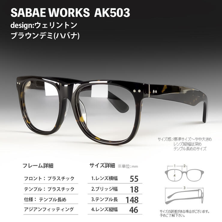 フレームの詳細 ブランド SABAE WORKS(鯖江ワークス) 品番・カラー AK503 ブラウンデミ サイズ 1) レンズ横幅:55mm 2) ブリッジ幅:18mm 3) テンプルの長さ:148mm 4) レンズ縦幅:46mm 5) 表記サイズ:55□18-148 (天地46) 素材・仕様 ウェイファラー ウェリントン プラスチック(フロント・テンプル) 参考定価 22,000円(税込) レンズ加工 日本・鯖江(メガネショップzigen) 製造・調整・仕上げ 日本・鯖江(SABAE WORKS) 付属品 ソフトケース・眼鏡拭き・取扱説明書 (※保証書ではありません) おすすめの性別 男性 メンズ men's UNISEX DESIGN/男女兼用 ●レンズの詳細 レンズ種類 HOYA 視力補正用薄型レンズ メーカー HOYAビジョンケアカンパニー ニコンレンズウエア 他など 素材・屈折率 UVカット標準装備プラスチックレンズ 1.60 薄型単焦点メガネレンズ コーティング ハードコート(キズ防止コート) マルチコート(反射防止コート) 水やけ防止コート ハイビジョン仕様 参考定価 15,400円(2枚1組/税込) レンズ加工 日本・鯖江(メガネショップzigen) 調整・仕上げ 日本・鯖江(SABAE WORKS) レンズの詳細 レンズ種類 視力補正用累進レンズ メーカー HOYAビジョンケアカンパニー ニコンレンズウエア 他など 素材・屈折率 UVカット標準装備プラスチックレンズ 1.60 内面累進設計 多焦点 コーティング ハードコート(キズ防止コート) マルチコート(反射防止コート) 撥水・水やけ防止コート ハイビジョン仕様 参考定価 22,000円(2枚1組/税込) レンズ加工 日本・鯖江(メガネショップzigen) 調整・仕上げ 日本・鯖江(SABAE WORKS) クイックリンク 遠近両用メガネ 遠近両用タイプはこちらから 老眼鏡 老眼鏡はこちらからレイバンのウェイファラーをインスパイア! キレカジ・イケおじの必須アイテム! サングラステイストのウェリントンフレームを老眼鏡(シニアグラス・リーディンググラス)にしてみました。。 フロントは格好いいウェリントンタイプ。テンプルは長め・こだわりウェリントンタイプ。 格好いいおしゃれなフレームは、いけてるメンズやレディースにも人気のアイテムです。 レンズはHOYAの薄型レンズ・左右違いの度数も対応可能です。視力補正用レンズをオーダーしますので、安心してお使いいただけます。 老眼鏡ユーザー・老眼鏡ヘビーユーザーにも変わらず人気ですが、はじめて老眼鏡/遠近両用メガネをご利用になる方や、とりあえず老眼鏡/遠近両用メガネを試したい方にもお勧めです。 リビング・ダイニング・ベッドルーム・オフィスなど、各部屋に1本づつ老眼鏡を置いたり、車やバックの中にも入れて、便利にシニアグラスをお使い下さい。 ※老眼鏡は主にお手元の視界を矯正するもので、遠方視が出来ませんが、お仕事、デスクワーク、パソコン、読書、園芸、手芸、ジオラマ、ご趣味など、見る物によって眼鏡を使い分けたり、自宅用、会社用、携帯用、ご旅行用など、複数お持ちになるとより一層便利です。 ●視力補正用レンズをオーダーしますので、左右違いの度数も対応可能です。 ●近視・乱視度数やブルーライトカットコートは、有料のオプションレンズにて対応いたします。 ●レンズはオーダー品の為、ご注文後の度数の変更、キャンセルはできません。 ●対応するレンズ度数(選べるレンズの度数) 近用単焦点レンズ ※近くを見る部分(老眼の度数) +0.25 +0.50 +0.75 +1.00 +1.25 +1.50 +1.75 +2.00 +2.25 +2.50 +2.75 +3.00 +3.25 +3.50 +3.75 +4.00 ±0.00(度なし) 視力補正用レンズをオーダーしますので、左右違いの度数も対応可能です。 レンズは安心と信頼のHOYAビジョンケアカンパニーのブランドレンズを使用します。 眼鏡専門店が取扱う視力補正用の光学レンズ。目にも優しく、安心してお使いいただけます。 ●近視・乱視・処方箋・ブルーライトカットコートは、有料のオプションレンズにて対応いたします。 ●度あり・処方箋での製作は、「【購入前に】店長に質問する」よりお問い合わせください。 ●レンズはオーダー品の為、ご注文後の度数の変更、キャンセルはできません。 ●対応する遠近両用レンズ度数(選べるレンズの加入度数) 近くを見る部分は老眼の度数※加入度(ADD) +1.00 +1.25 +1.50 +1.75 +2.00 +2.25 +2.50 +2.75 +3.00 上記以外の加入度 【+0.75 +3.25 +3.50】 近視・乱視などの処方箋デー・ブルーライトカット仕様の製作はオプションレンズにて対応しております。 レンズは安心と信頼のHOYAビジョンケアカンパニーのブランドレンズを使用します。 眼鏡専門店が取扱う視力補正用の光学レンズ。目にも優しく、安心してお使いいただけます。 ●近視・乱視・処方箋・ブルーライトカットコートは、有料のオプションレンズにて対応いたします。 ●度あり・処方箋での製作は、「【購入前に】店長に質問する」よりお問い合わせください。 ●遠近両用メガネのレンズ特性をご理解いただける方のみご利用下さい。 ●遠近両用メガネは、遠用重視の眼鏡(常用のメガネ)となります。 ●遠用度なしの設定の場合、レンズ特性や掛け方によっては、度なしであっても極微量の度数が感じら