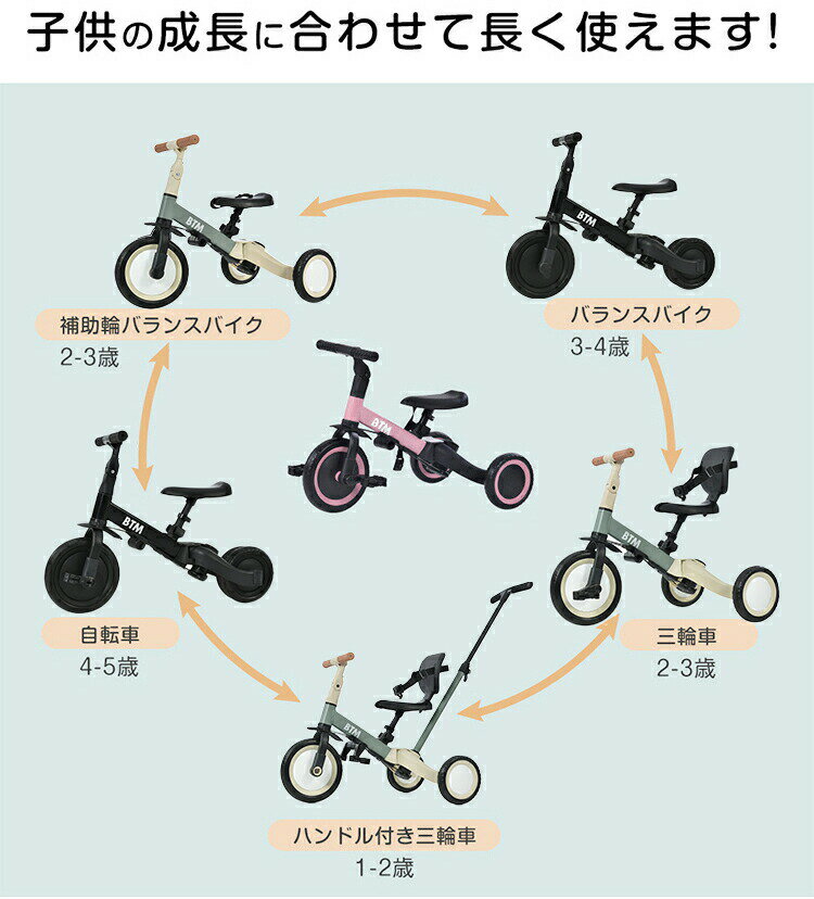 子供用三輪車 5in1 三輪車のりもの BTM 押し棒付き 自転車 おもちゃ 乗用玩具 幼児用 軽量 キッズバイク プレゼント 新作登場 ギフト 1年安心保証 誕生日プレゼント クリスマス