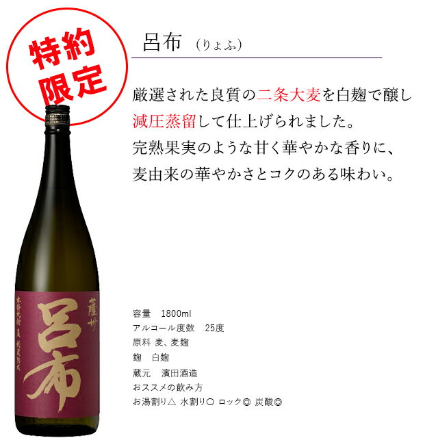 商品詳細 ■商品番号 258326 ■商品種別 麦焼酎 ■内容量 1800ml×6本 ■アルコール度数 25度 ■麹菌 - ■蒸留方法 - ■メーカー - ■原材料 麦 コメント 薩摩 麦焼酎飲み比べ(野海棠・呂布・田苑金ラベル・白猿・うかぜ・琳の華) 25度 1800ml×各1本 計6本 鹿児島で造られたこだわりの本格麦焼酎をセットにしました。飲みやすい酒質から、樽貯蔵、常圧、減圧蒸留など楽しめるセットになっております。ぜひ薩摩の麦焼酎をお試しください!