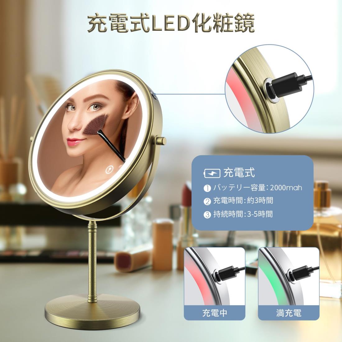 MILPROX 化粧鏡 ライト付き 女優ミラー 1倍5倍拡大鏡 USB充電式 2000mAh大容量 寒暖自然色調節 明るさ調節 タッチ式 360度回転 卓上ミラー スタンドミラー