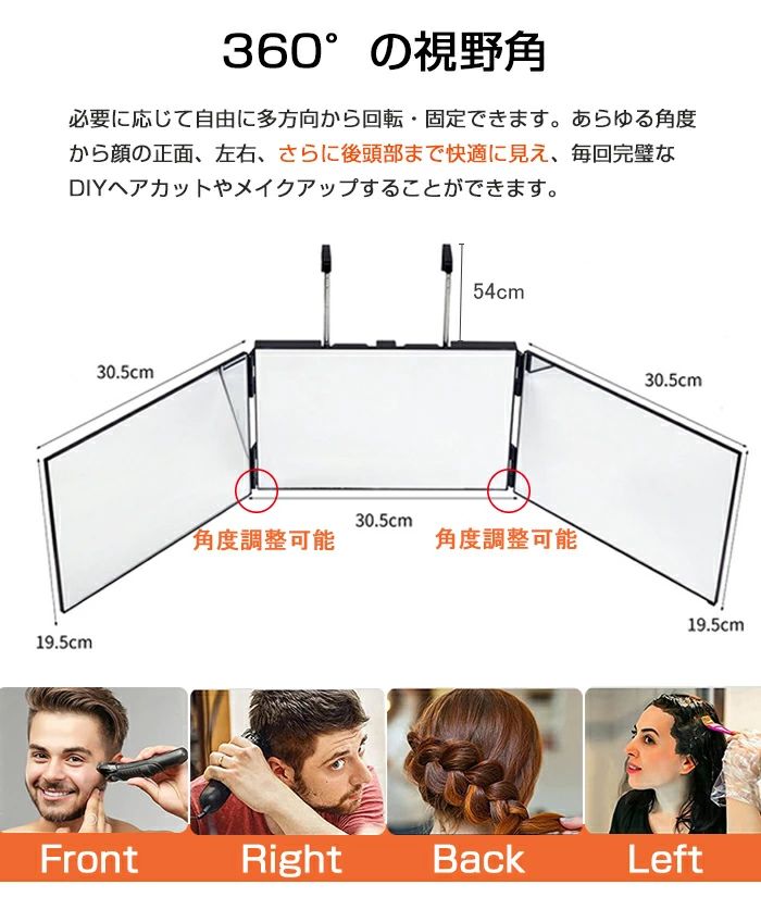 商品名: 三面鏡 壁掛け LEDライト付き カラー:ブラック、ホワイト サイズ:約240*60*350MM セット内容:三面鏡本体*1、USBケーブル*1、10倍拡大鏡*1、取り付け用フック*2 素材:ABS 重量:約1500g 充電時間:約4時間 生産国:中国 360°の視野角 必要に応じて自由に多方向から回転・固定できます。あらゆる角度 から顔や頭などを快適に見え、毎回完璧なDIYヘアカットやメイク アップすることができます。 明かさ調節可能 ワンタッチでLEDライトをON/OFFにします。長押しすると明るさが 無段階調整可能で、朝方や夜など暗い時間帯にも気軽にメイクしたり、 髪を整えたり、髭を剃ったりすることはできます。 28個LEDライト 28個の高輝度ledライトになって肌の隅々まで照らし、光は均一で 柔らかく、より繊細なメイクを与えられます。 幅10MMまでの補助光が顔全体を照らす! 10倍拡大鏡付き 10倍拡大鏡付きなので、メイクをするときに局所的なメイク効果 をはっきりと見ることができます。アイメイク・ リップメイク などをよくチェック! 拡大鏡を直接鏡面に吸着することができます。 折りたたみ式ミラー 使用しない時は折りたたんでコンパクトに!ほこり・傷から守ることが できます。3面鏡だけではなく、普段使い用の卓上化粧鏡としてもお 使いいただけます。洗面台・化粧台・部屋・更衣室などに大活躍! 吊り下げ式&壁掛け お好みの高かさ(高さ調節可能:0-54cm)を自由に調節出来るのがポイント! ドア、ワードローブ、壁などの場所に簡単掛けることができ、テーブルやカウン ターの上においてそのままお使え、また、付属の無釘フックで鏡を壁に掛ける こともできます。 いろんな場所に大活躍 自宅で化粧、髭剃り、髪染め、パーマをしてもいいです。時間とお金を節約することはできます。 卓上ミラー ライト付き 卓上 三面 鏡 大きめ 鏡 壁掛け おしゃれ