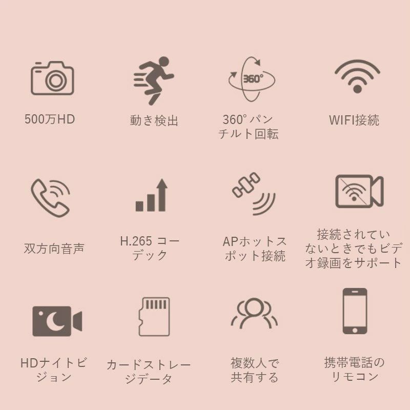 商品説明 商品情報 【500万画素】 2023年最新強化版の防犯カメラは、500万画素の1920P(2560*1920 2K)高画質レンズを搭載しており、200万画素の1080Pや300万画素、400万画素を上回る鮮明な映像を提供します。また、デジタルワイドダイナミックレンジ機能を備えており、逆光環境下でもクリアな映像を提供します。さらに、水平方向に355°パン、垂直方向に45°(水平方向に向上する角度は70度です)チルトすることで、部屋全体をスマホで鮮明に監視することができます 【キレイな暗視効果】 夜間には、星光級のレンズと3つのライトモードが備わっており、カラーで映像を提供します。最大8メーターの優れたナイトビジョンを実現し、自動暗視で暗い場所でも赤ちゃんやペットをはっきりと見ることができます 【遠隔視聴&共有】 Wi-Fi、AP(10M以内のWi-Fiがない環境)接続に対応し、さまざまなセキュリティに活用できます。例えば、ペットの見守りや高齢者の見守り、お子様の見守り、家の防犯、倉庫や店舗の監視など、室内監視に最適です。スマホなどでの遠隔操作と監視も可能で、離れた場所からもリアルタイムに監視することができます。AI人型識別や追跡録画の警備モードを使用することで、いつでもどこでも警報アラームをスマホで受け取ることができます。さらに、カメラを簡単にご家族と共有可能で、猫や犬などペットやベビー見守りに一緒に楽しめます。 【動体検出】 動体検知動画はマイクロSDカード(別売り)に保存され 保証期間 120日間保証 ご使用中においてのお客様の過失による故障、破損、改造等はサポート保証の対象外となります。 注意事項 ●運送事故により箱が潰れる可能性がございます。 ●モニターの違いにより、実際の商品の色が画像と異なる場合があります。