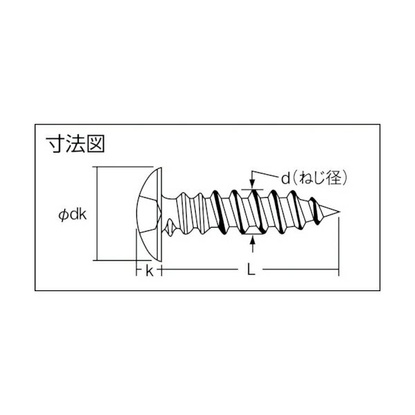 トラスコ中山(株)特長・頭部外径が大きい丸頭形状で、タップやナットを使用せず、下穴だけで締結ができる薄板鋼板用のねじです。・環境負荷の少ない三価クロメート品です。商品スペック仕様・規格 ・パッケージ:ボルトンパック(ブリスター)・適合ドライバー M3〜M5:プラスNo.2M6:プラスNo.3・寸法(mm)d:M4・寸法(mm)L:8・頭部径(mm):8材質 ・低炭素鋼(SWCH)・表面処理:三価クロメート仕上げ(白)質量:134.4g 製造国 日本※掲載写真は代表画像です。