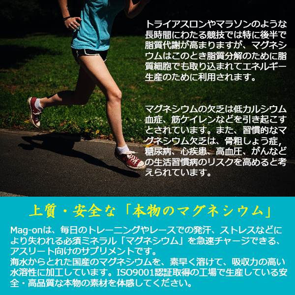 Mag-on(マグオン) エナジージェル アップル 12個入り 商品説明 エネルギーとマグネシウムを同時チャージ エネルギーと同時にマグネシウムを素早く摂れるエナジージェルが登場。 一般的な補給ジェルと同等のスペックをもちつつ、Mag-onの最大の特徴である吸収率の高い水溶性マグネシウムを50mg配合。 携帯しやすく、そのまますぐに飲めるジェルタイプなので、大切なレースや運動・競技中にオススメ。 トライアスロンや登山、野球、サッカー、テニス、バスケットボール、ゴルフなど、トレーニング時運動で発汗した後のマグネシウム補給に。 普段の体調管理や、レースに向けたコンディショニングの一環として、日常的に摂取することをおすすめします。 こちらの商品は基本的にご注文後の取り寄せとしております。納品まで3日から5日程度お時間をいただきますので、あらかじめご了解ください。 内容 1個(41g)マグネシウム50mg含有 アップルフレーバー:ジェルタイプ 容量 12個入り 素材 画像記載