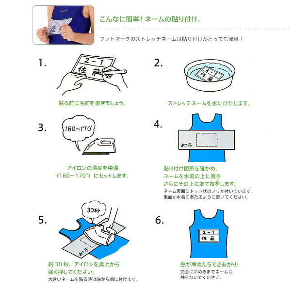 FOOTMARK フットマーク【10枚セット】スクール対応ストレッチネーム 無 水着/体操服用(日本製)101266 中(08×13cm) 商品説明 アイロンで簡単に貼り付けられるネーム。水着や体操服に!! お得な10枚セット☆ 伸縮性の高いストレッチ素材を使用しているので着用時の激しい動きにも対応します◎ ・安心の日本製◎ ・一枚ずつパッケージに入っています。 《ストレッチネームの貼り付け》 1.貼る前に名前を書きます。 2.ストレッチネームを水に浸します。 3.アイロンの温度を160-170度にセットします。 4.貼り付け箇所を確かめ、ネームを水着の上に置き、さらにその上にあて布をします。 5.約30秒、アイロンを真上から強く押してください。 6.熱が冷めたらできあがり! ■1枚入り×10 カラー 01シロ(無地) 素 材 ナイロン80%、ポリウレタン20%(2way) サイズ 中(8×13cm)