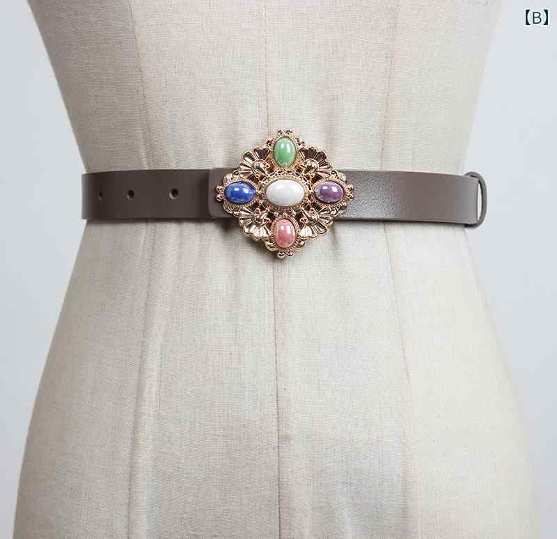 レディース レトロ カラフル 宝石 スムーズ バックル 牛革 装飾 ベルト スカート カーディガン ウエスト カジュアル ファッション